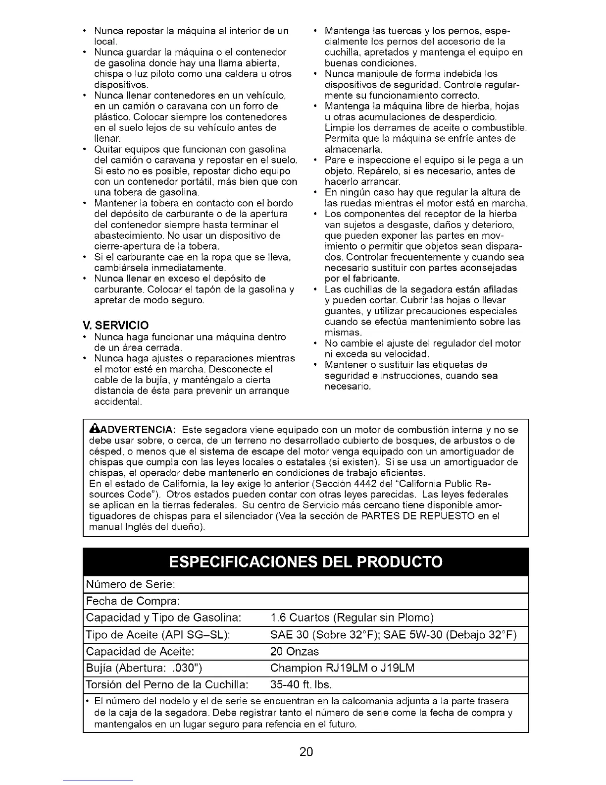 de la caja de la segadora. Debe registrar tanto el nQmero de serie come la fecha de compra y