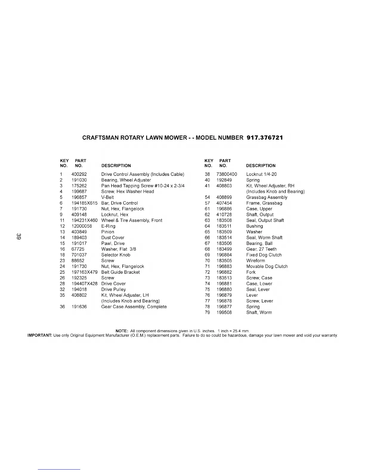 IMPORTANT: Use only Original Equipment Manufacturer (O.EM.) replacement parts. Failure to do so could be hazardous, damage your lawn mower and void your warranty.