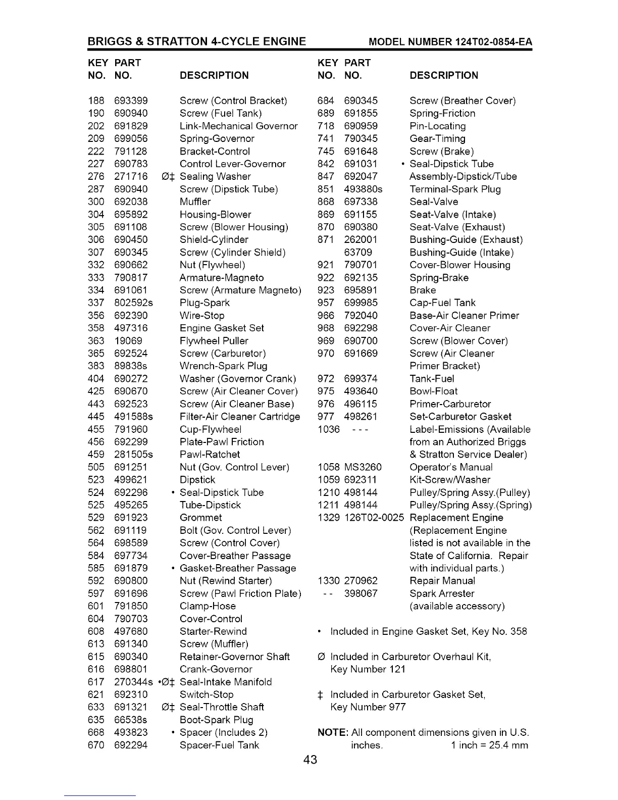 BRIGGS & STRATTON 4-CYCLE ENGINE MODEL NUMBER 124T02-0854-EA