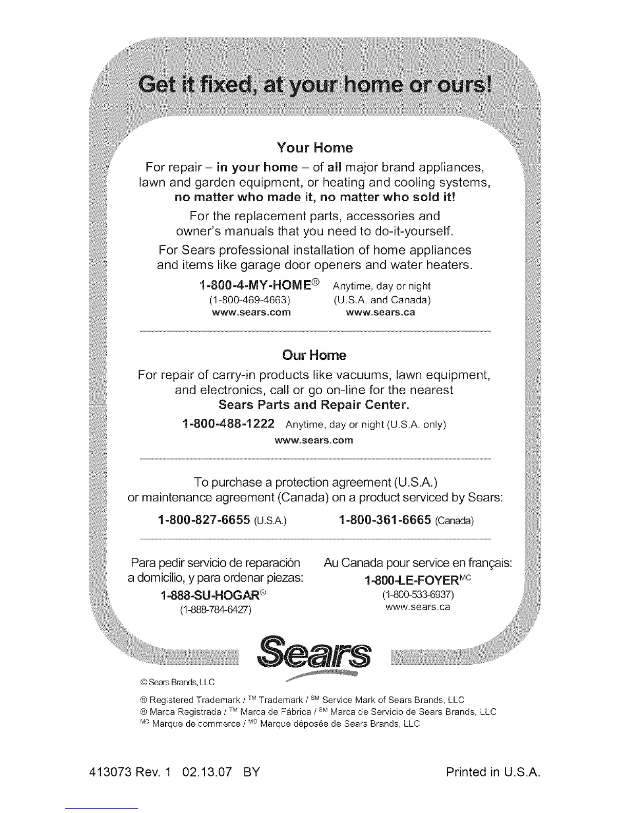 ® Marca Registrada / TM Marca de Fabrica / SMMarca de Servicio de Sears Brands, LLC