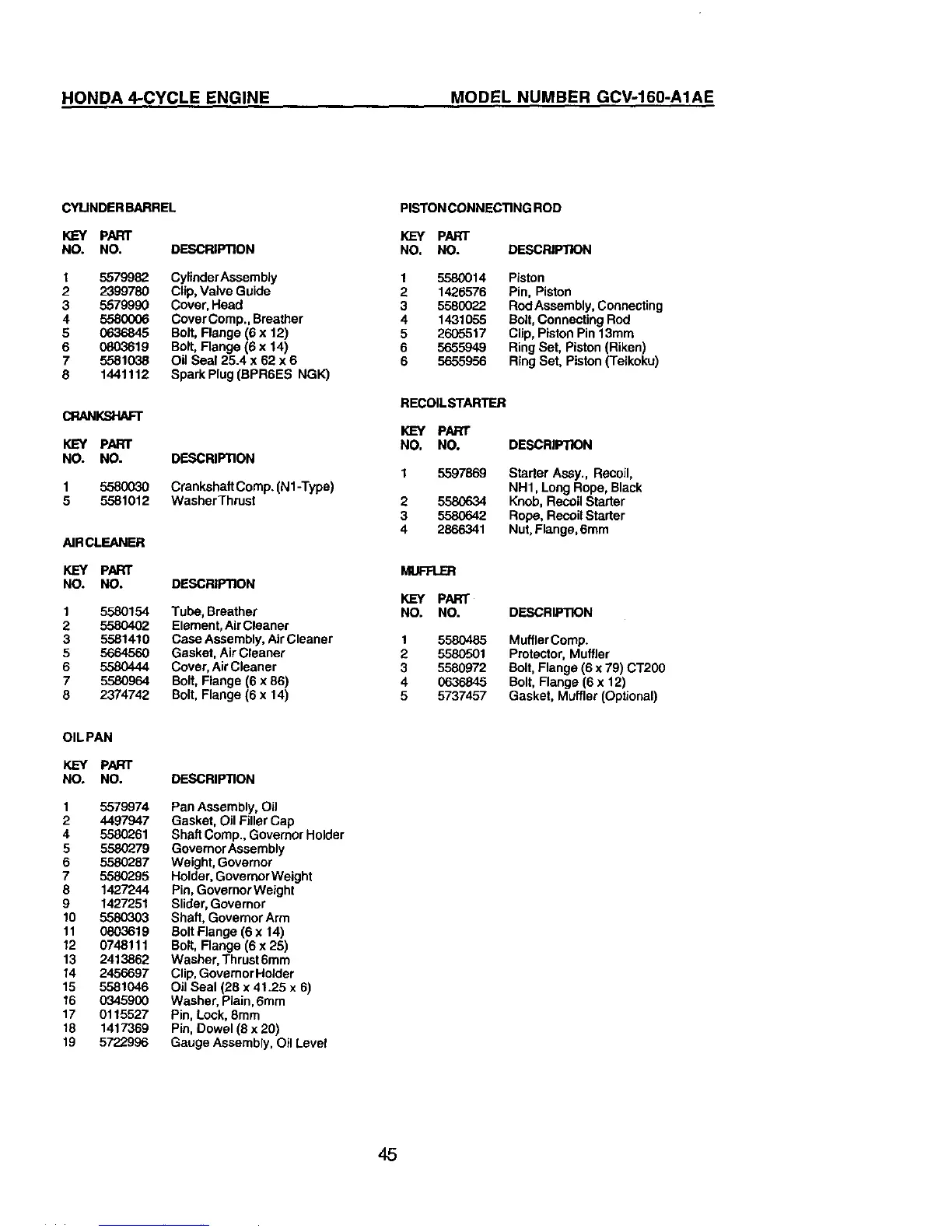 HONDA 4-CYCLE ENGINE MODEL NUMBER GCV-160-AIAE