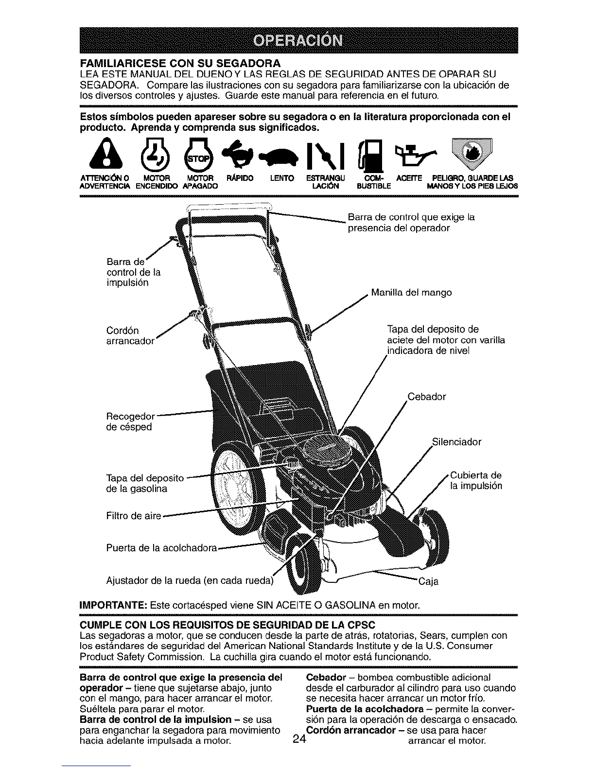 IMPORTANTE: Este cortac6sped viene SiN ACEITE O GASOLINA en motor.