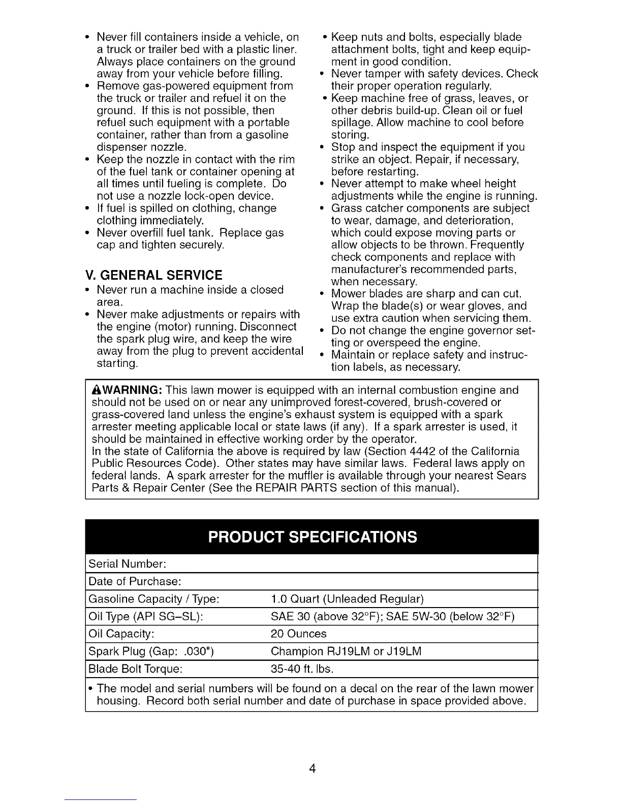 federal lands. A spark arrester for the muffler is available through your nearest Sears