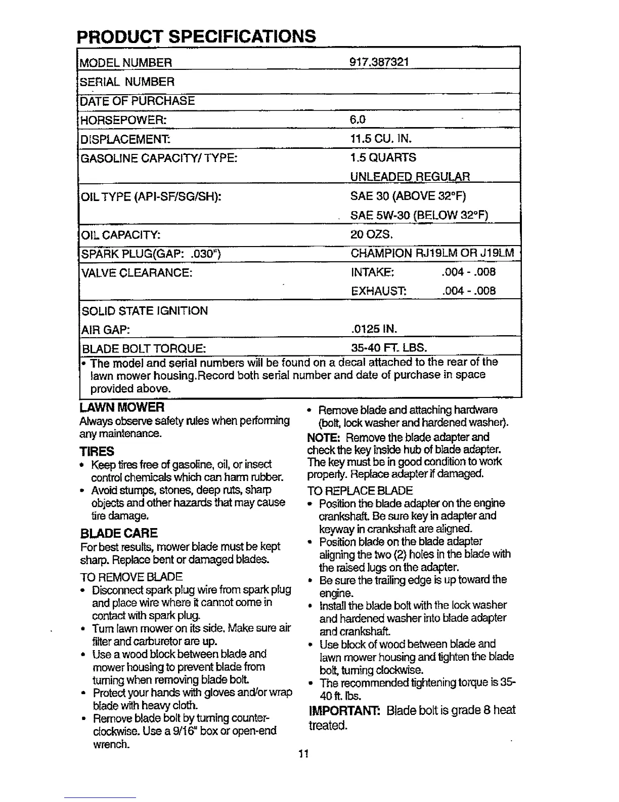 OiLTYPE (API-SF/SG/SH): SAE 30 (ABOVE 32°F)