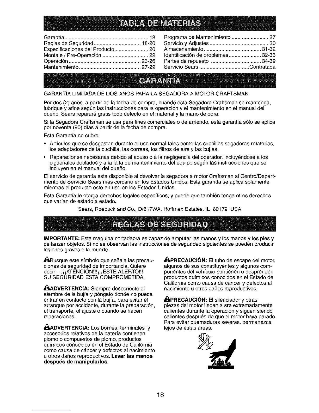 El servicio de garantfa esta disponibie al devolver la segadora a motor Craftsman al Centro/Depart-