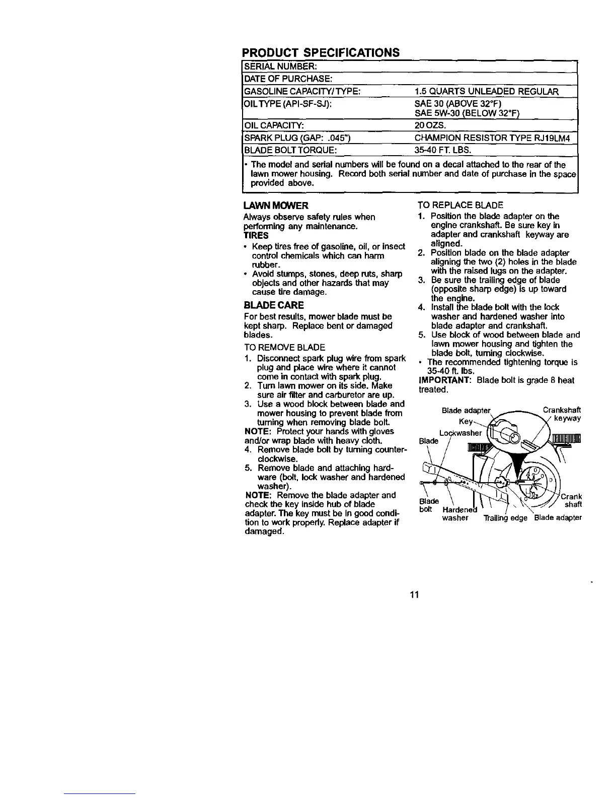 BLADE BOLTTORQUE: 35-40 FT. LBS.