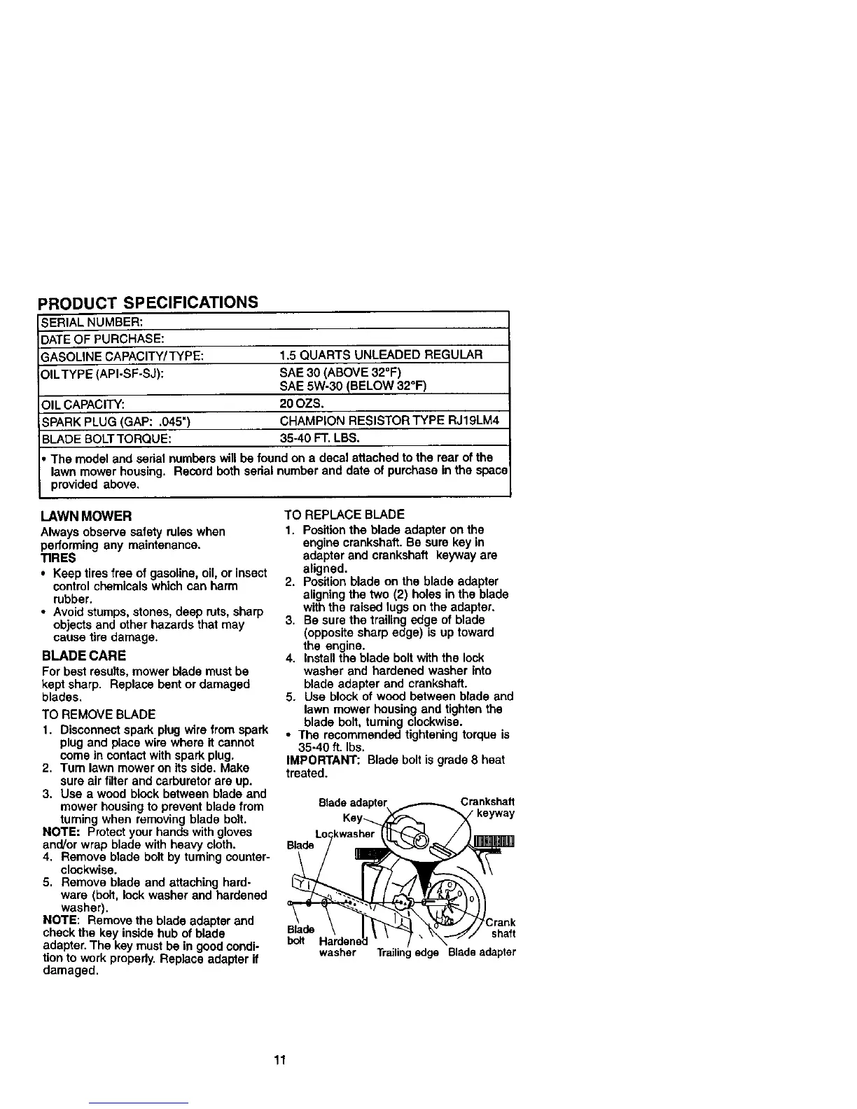 BLADE BOLTTORQUE: 35-40 FT. LBS.