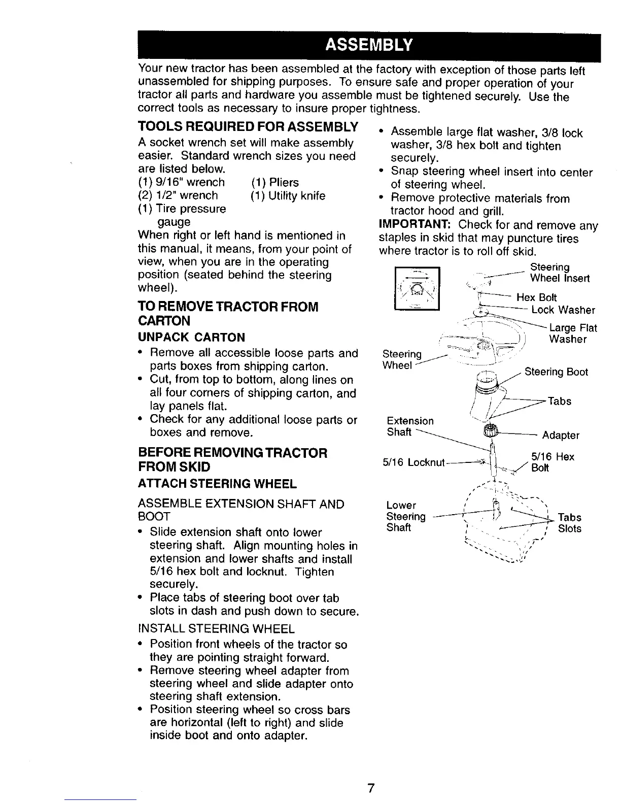 Your new tractor has been assembled at the factory with exception of those parts left