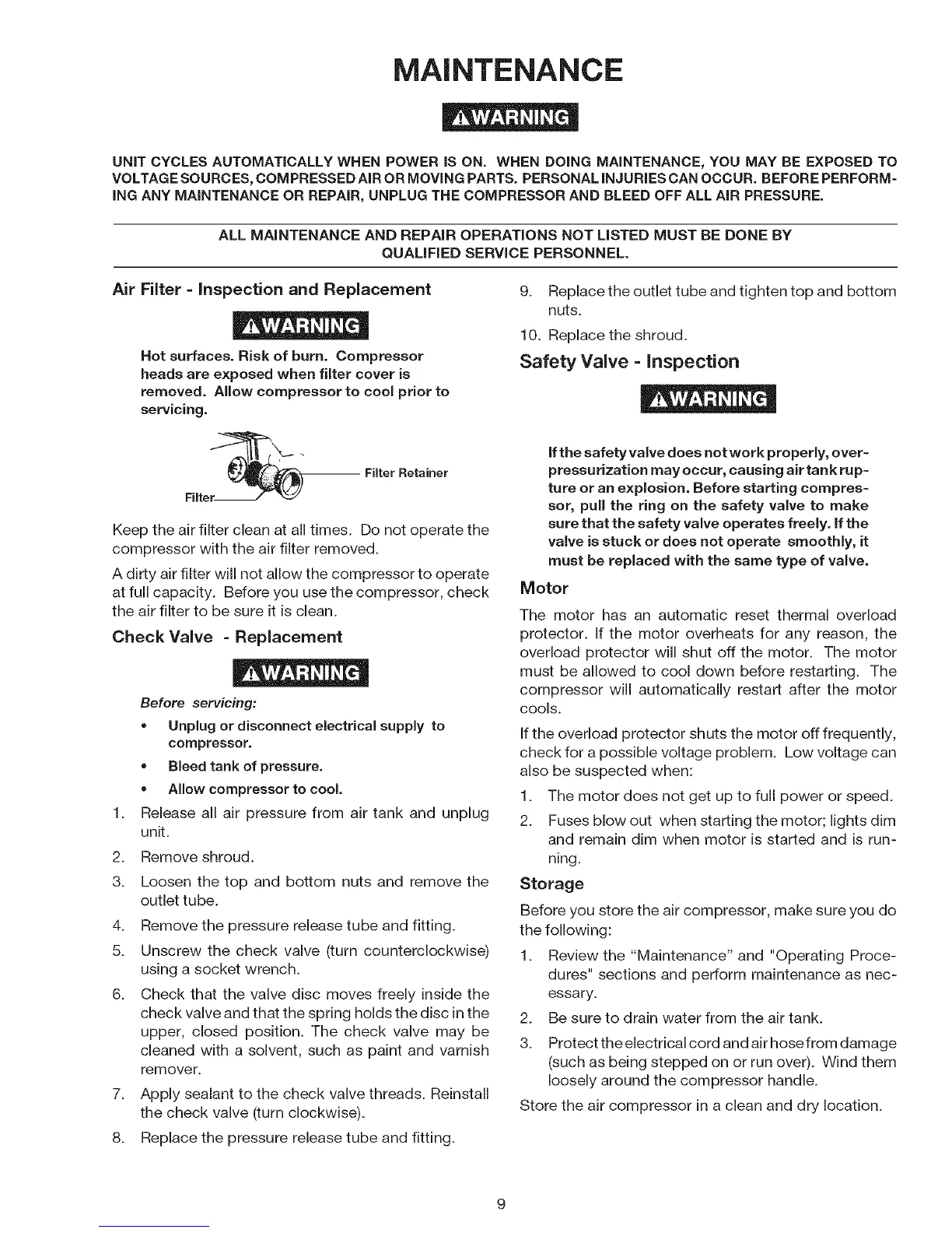 ING ANY MAINTENANCE OR REPAIR, UNPLUG THE COMPRESSOR AND BLEED OFF ALL AiR PRESSURE.