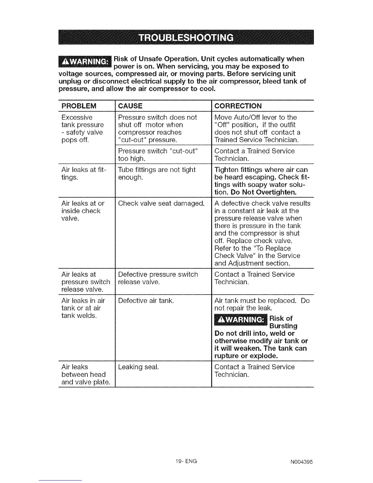 unplug or disconnect electrical supply to the air compressor, bleed tank of