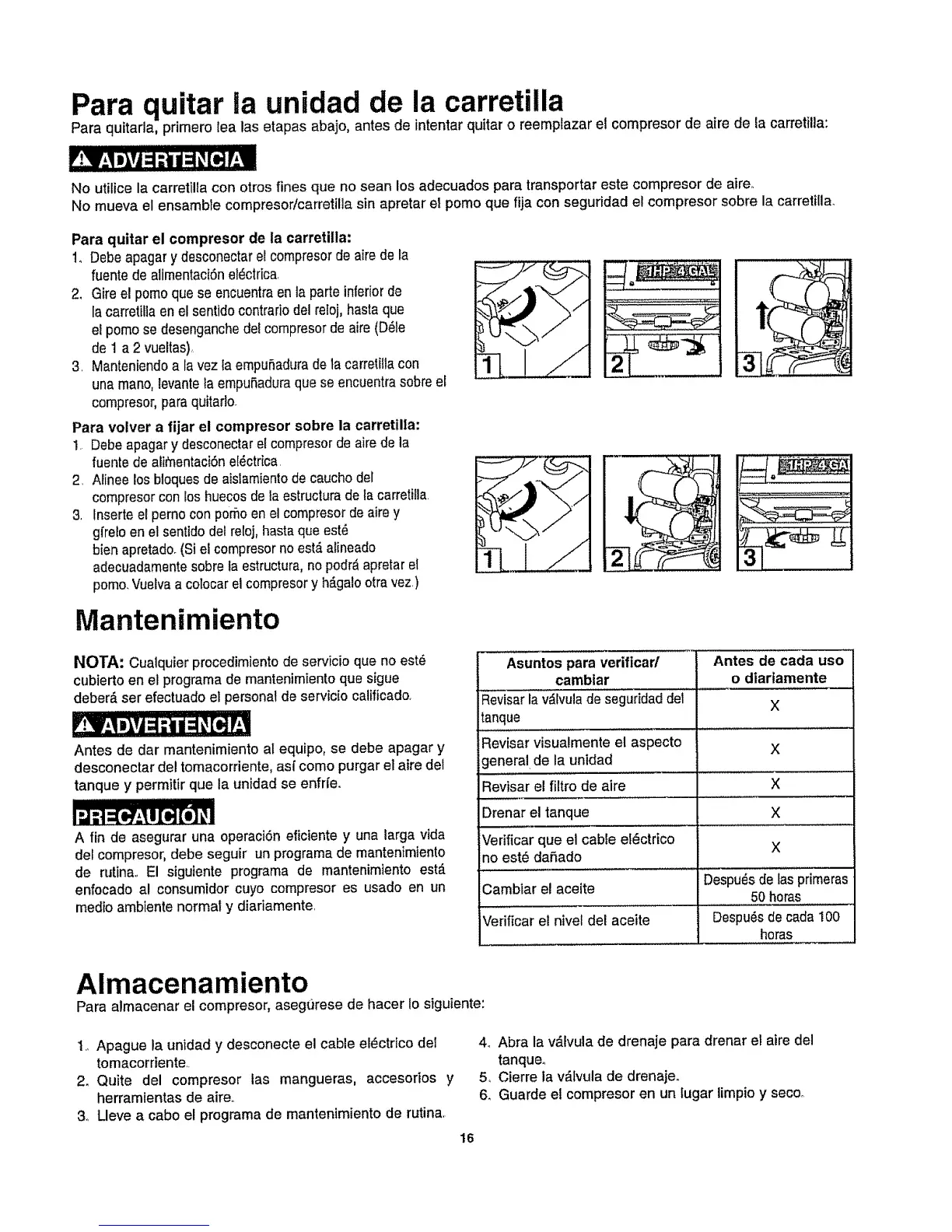 No utilice la carretilla con otros fines que no sean los adecuados para transportar este compresor de aJre_