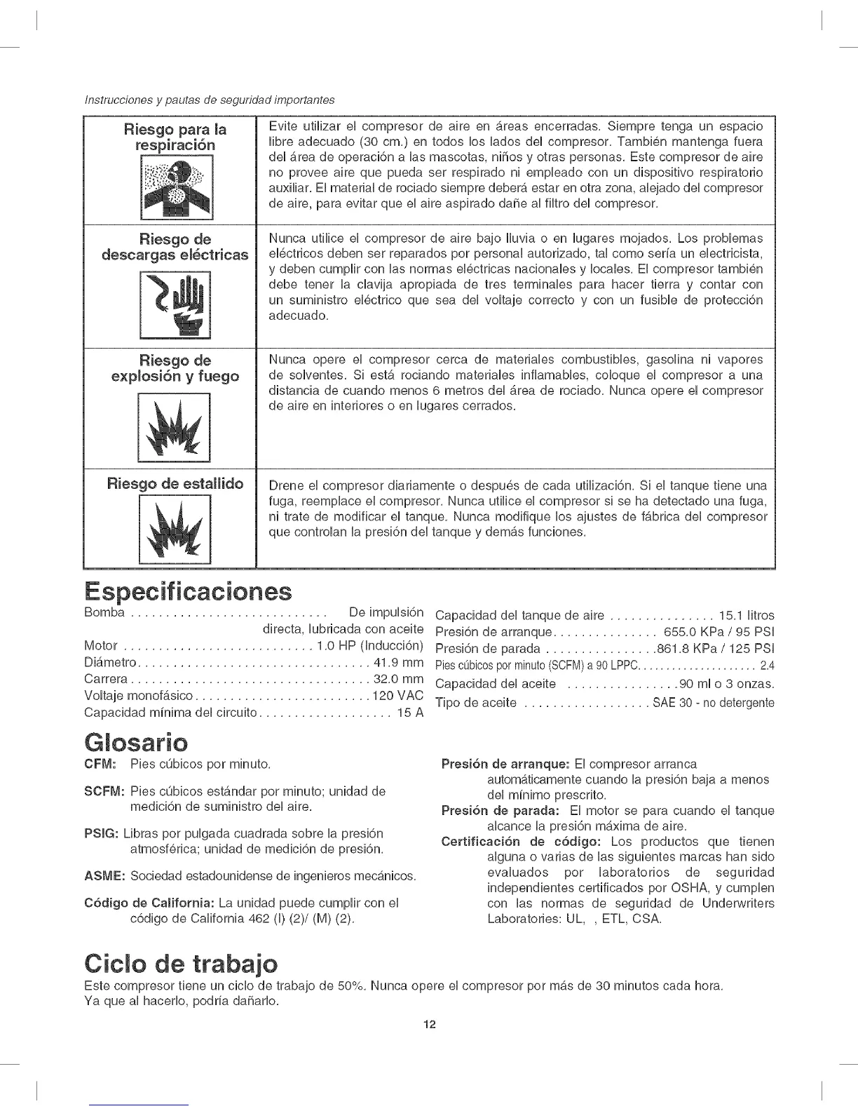 Este compresor tiene un ciclo de trabajo de 50%. Nunca opere el compresor por mas de 30 minutes cada hora.