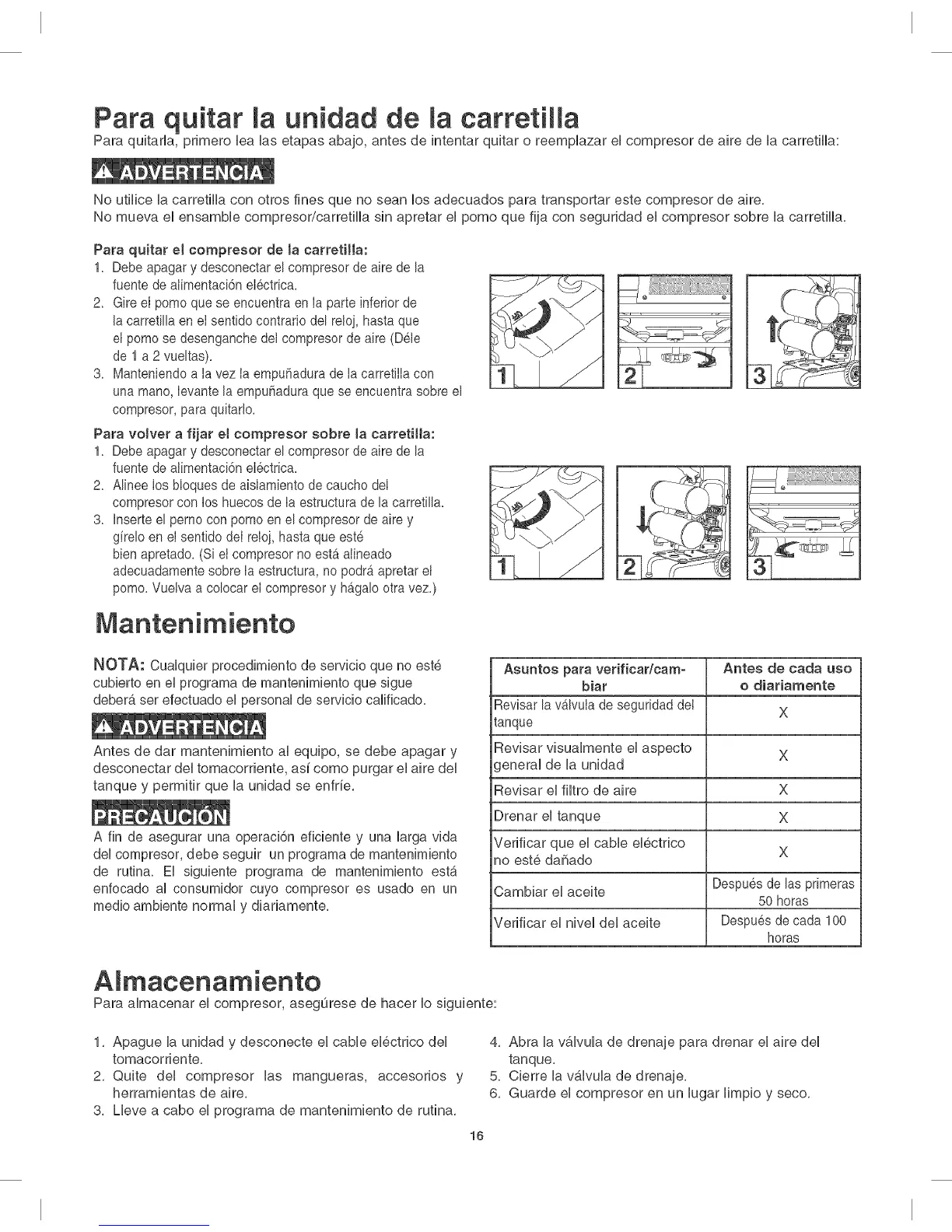 Para almacenar el compresor, asegOrese de hacer Io siguiente: