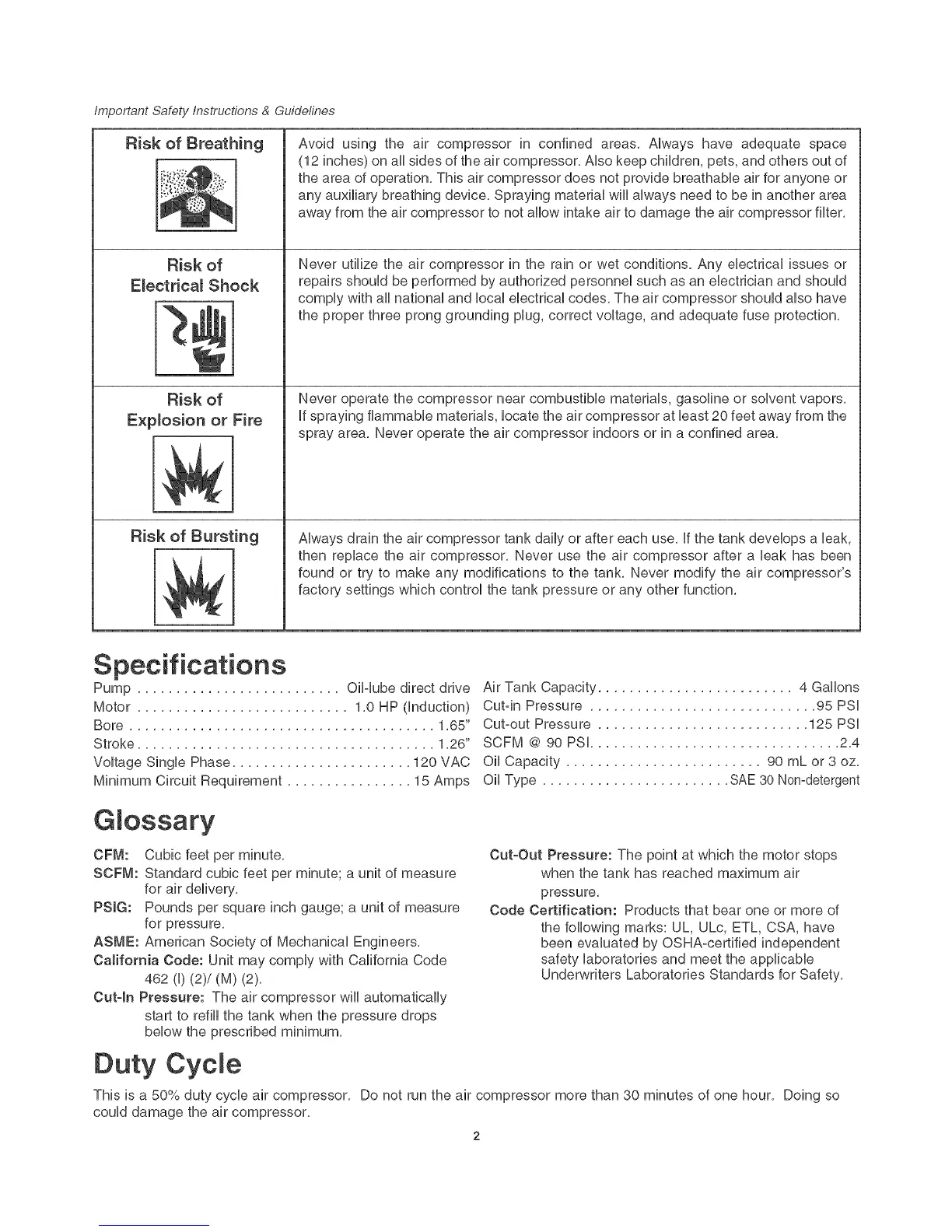 Pump .......................... Oil-lube direct drive Air Tank Capacity ......................... 4 Gallons