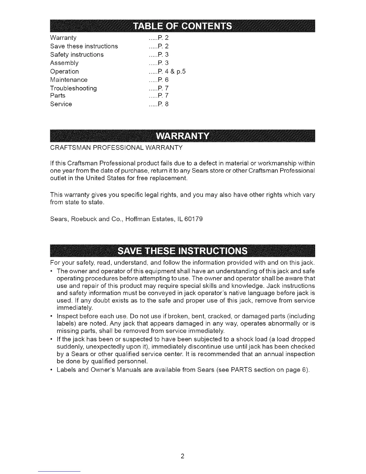use and repair of this product may require special skills and knowledge. Jack instructions
