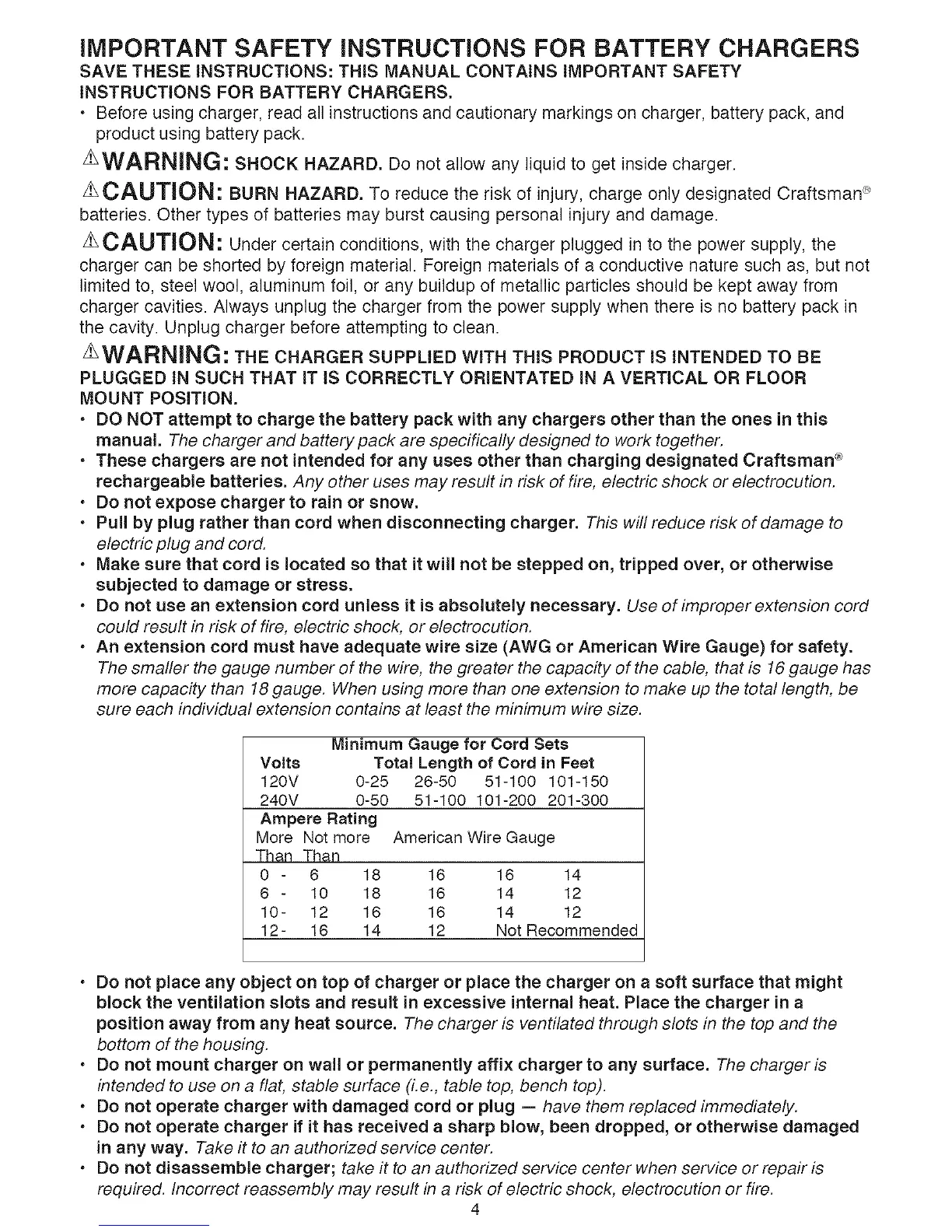 • These chargers are not intended for any uses other than charging designated Craftsman _>