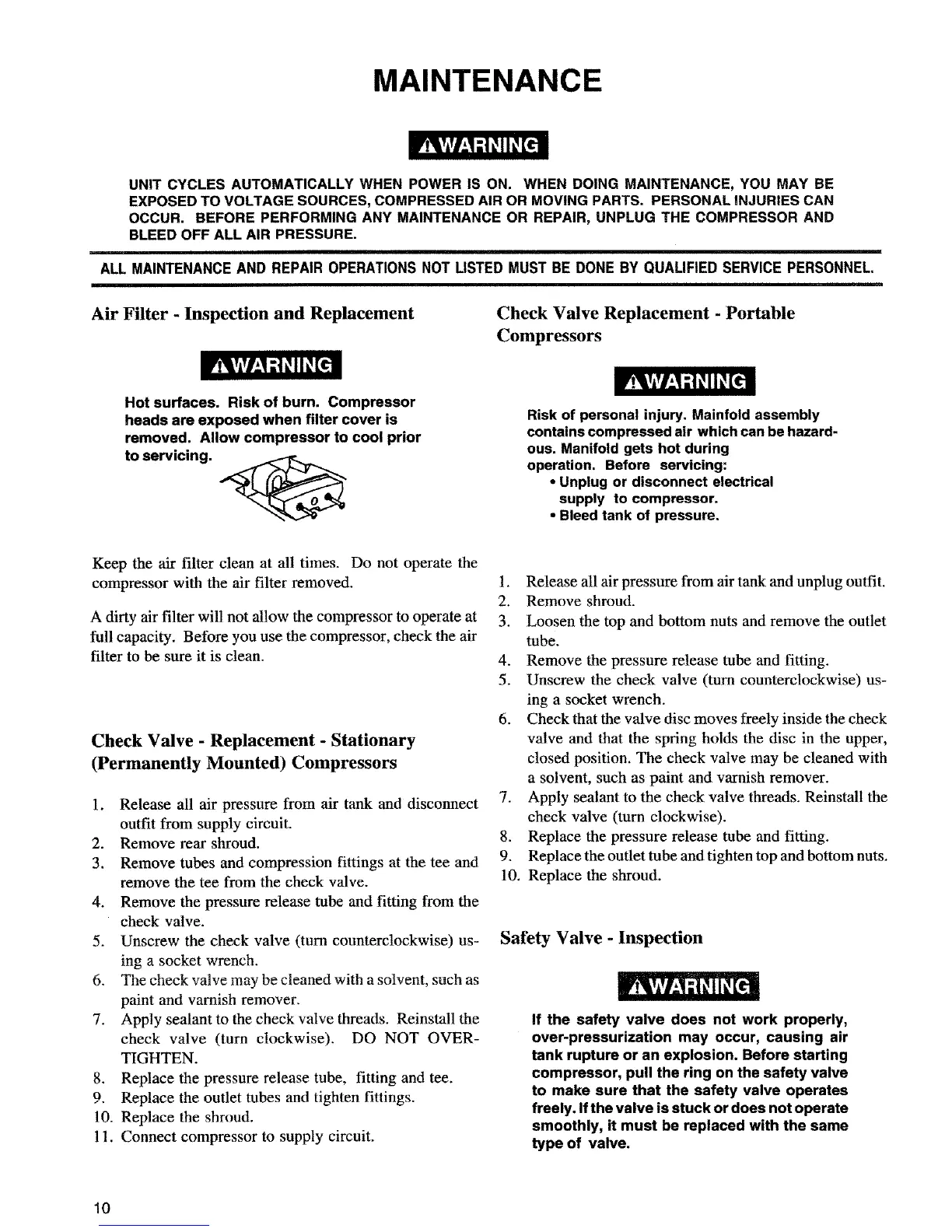 OCCUR. BEFORE PERFORMING ANY MAINTENANCE OR REPAIR, UNPLUG THE COMPRESSOR AND