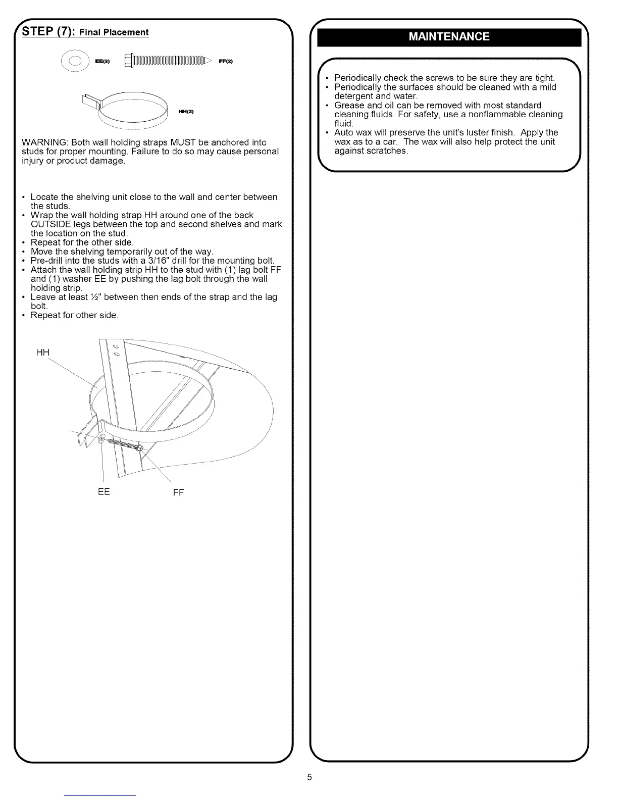 • Attach the walt holding strip HH to the stud with (1) lag bolt FF