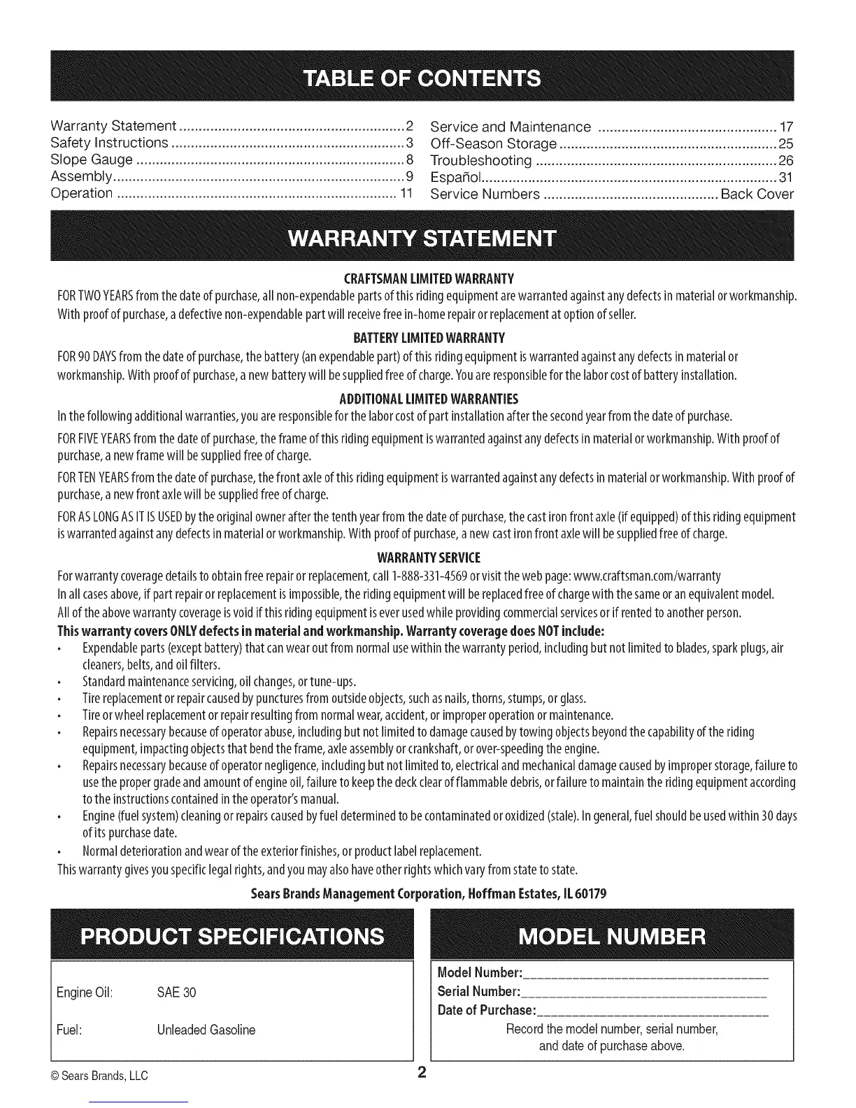FORTENYEARSfromthedateofpurchase,thefrontaxleofthisridingequipmentiswarrantedagainstanydefectsinmaterialorworkmanship.Withproofof
