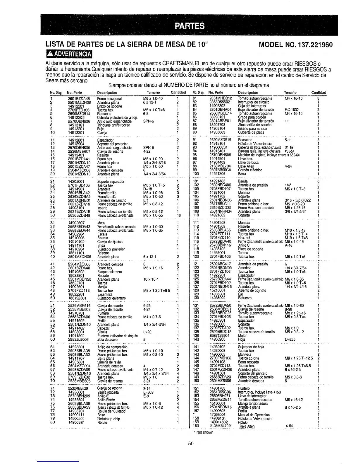 LISTA DE PARTES DE LA SIERRA DE MESA DE 10"