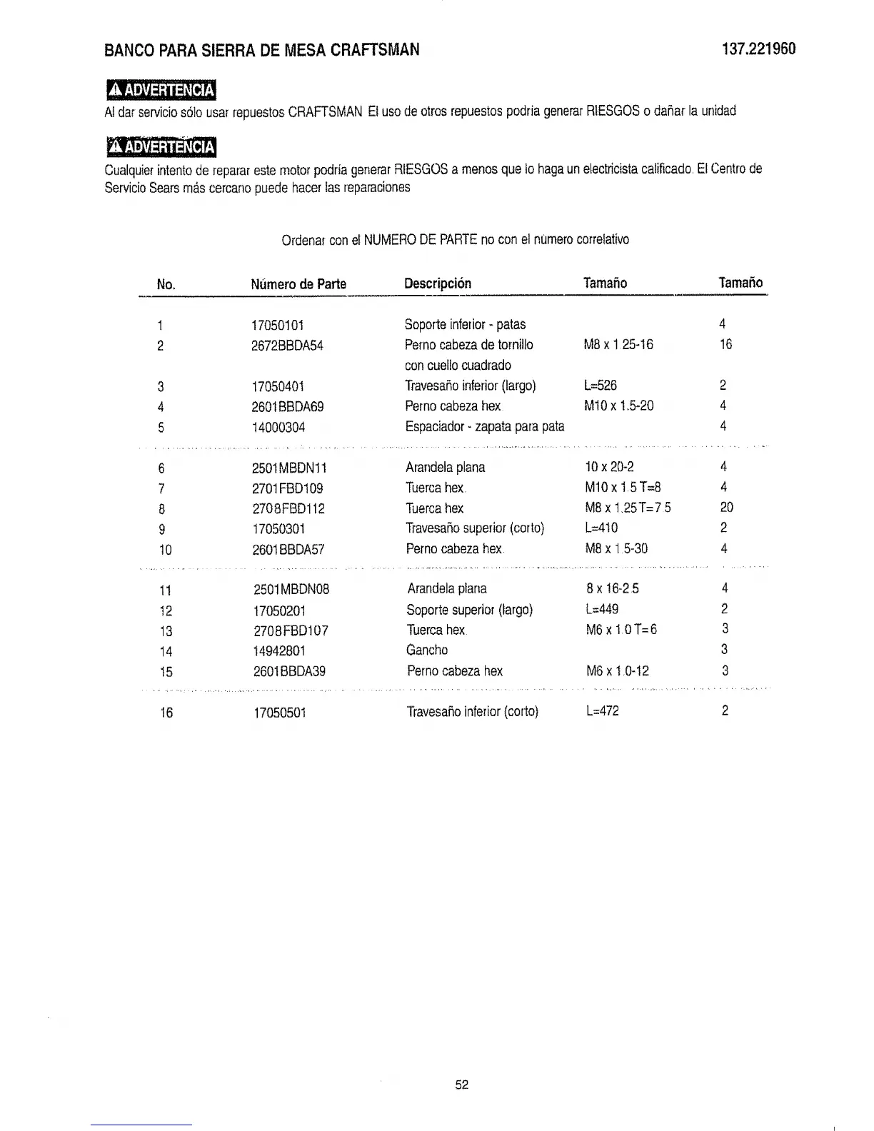 N dar serviciosSlo usar repuestosCRAFTSMAN El uso de otros repuestos podria generar RIESGOSo daSar la unidad