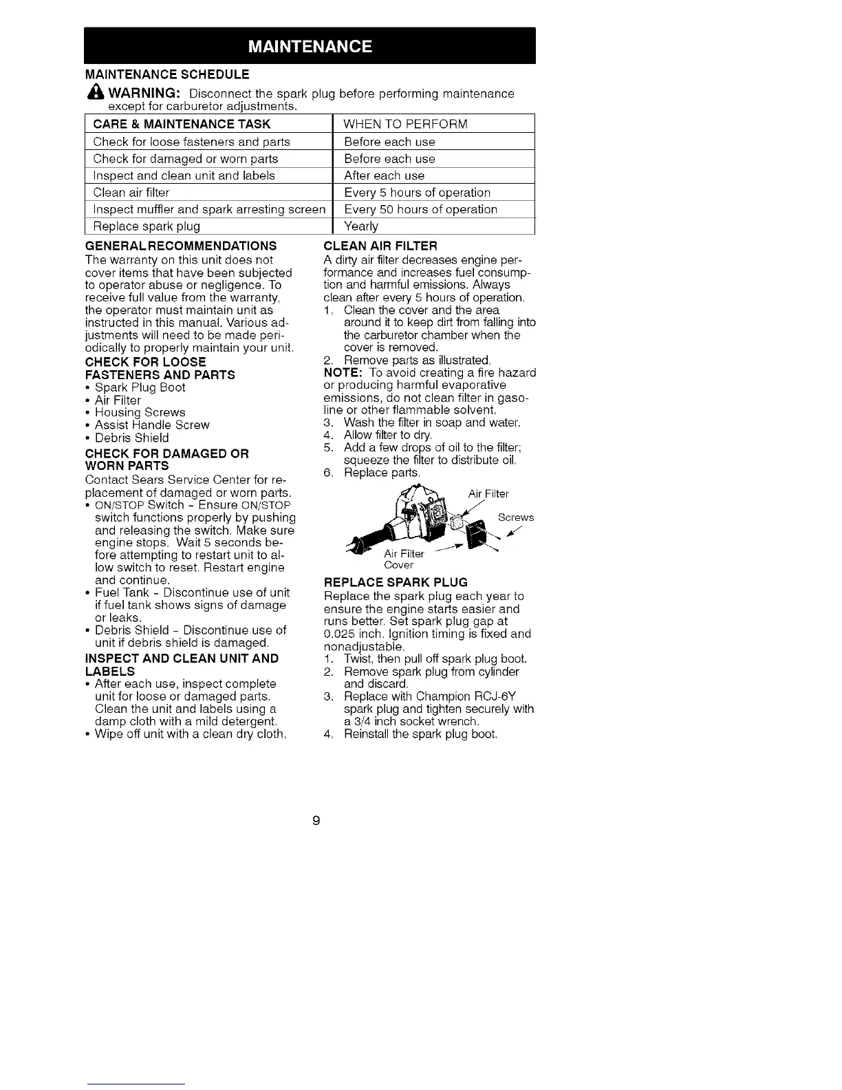 WARNING: Disconnect the spark plug before performing maintenance