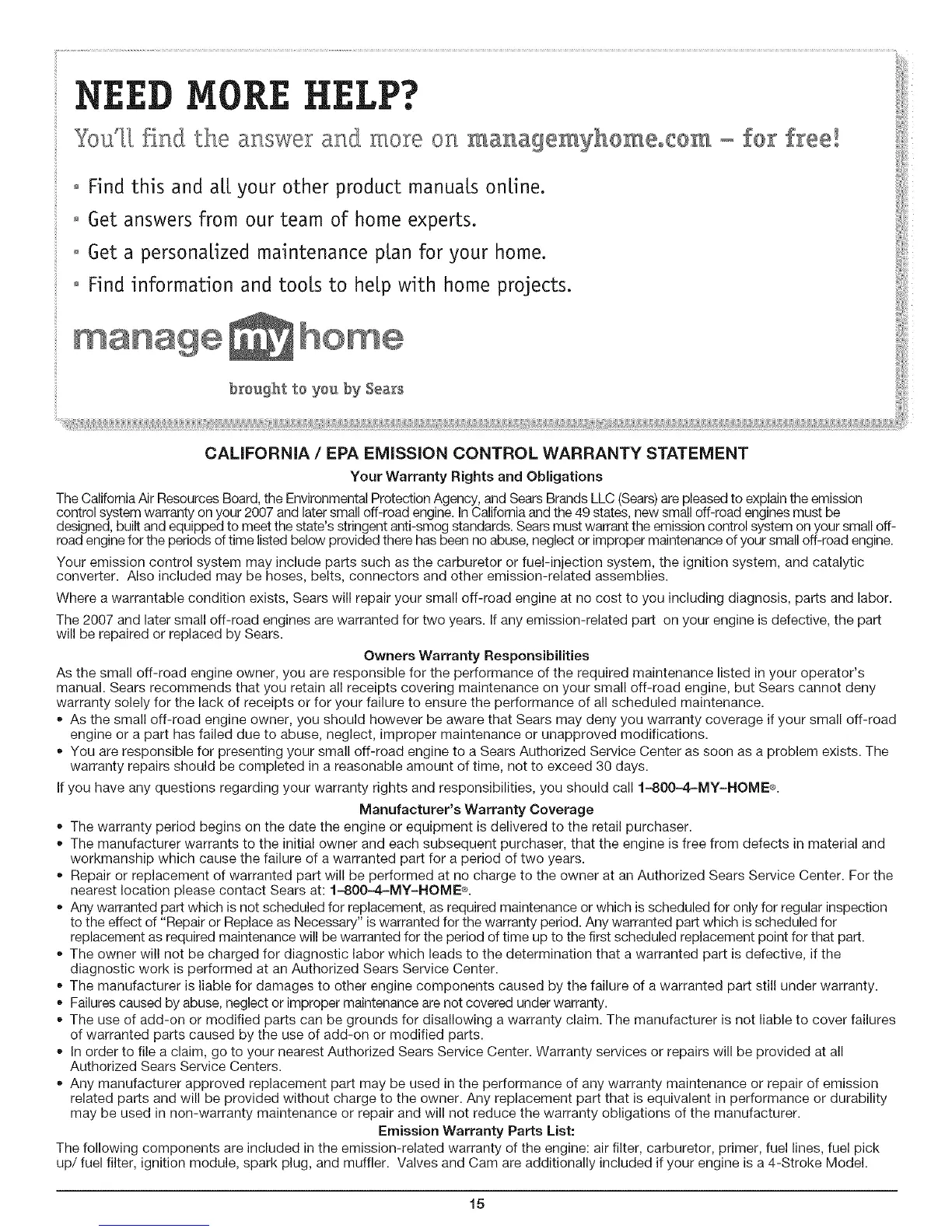 designed, built and equipped to meet the state's stringent anti-smog standards. Sears must warrant the emission control system on your small off-