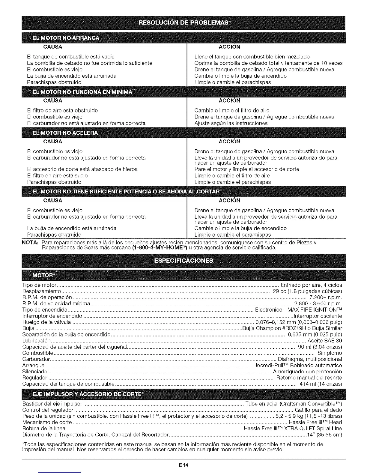 Diametro de la Trayectoria de Corte, Cabezal del Recortador ............................................................................................ 14" (35,56 cm)