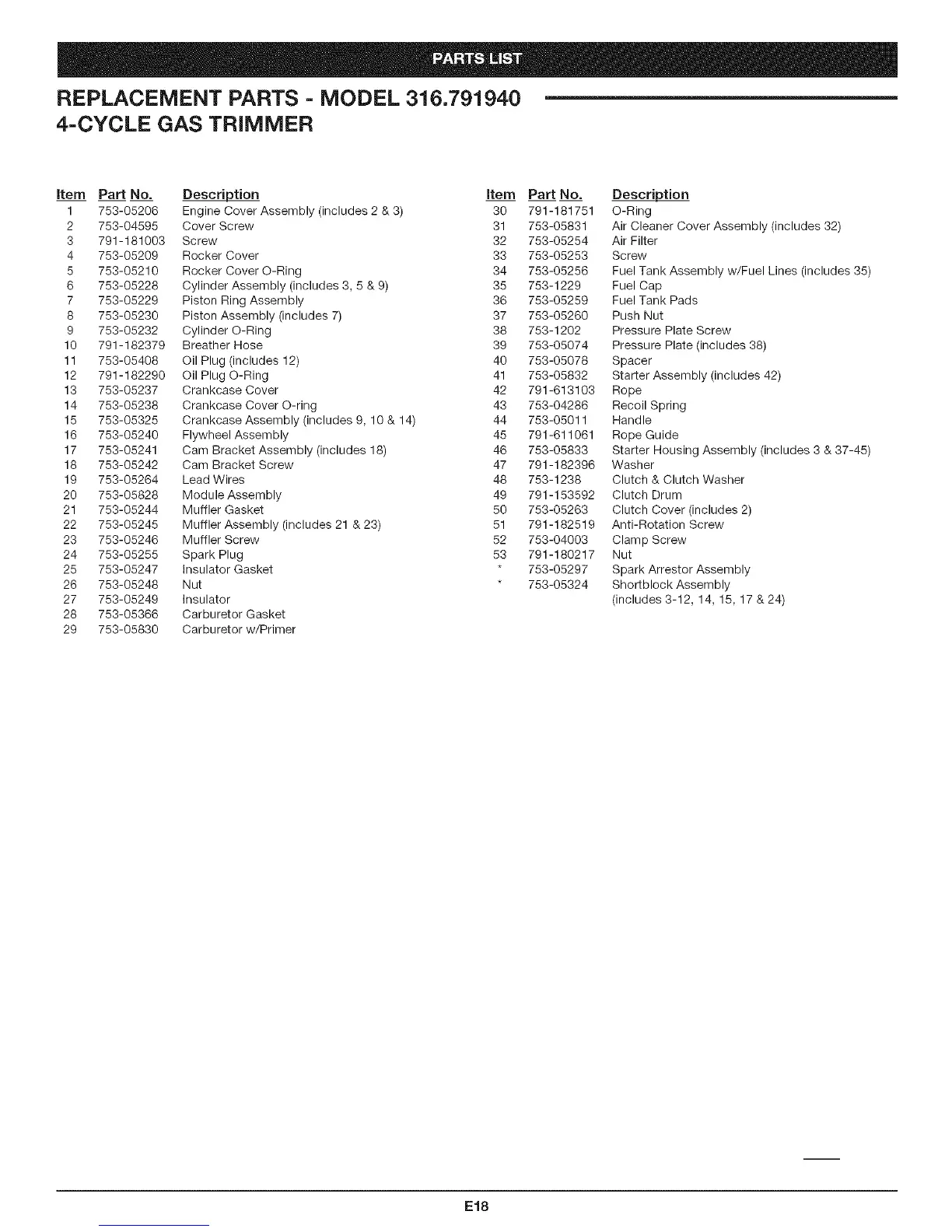 REPLACEMENT PARTS - MODEL 316.791940