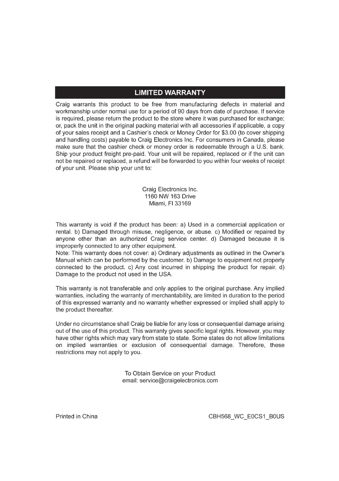 Craig CBH568 - Limited Warranty