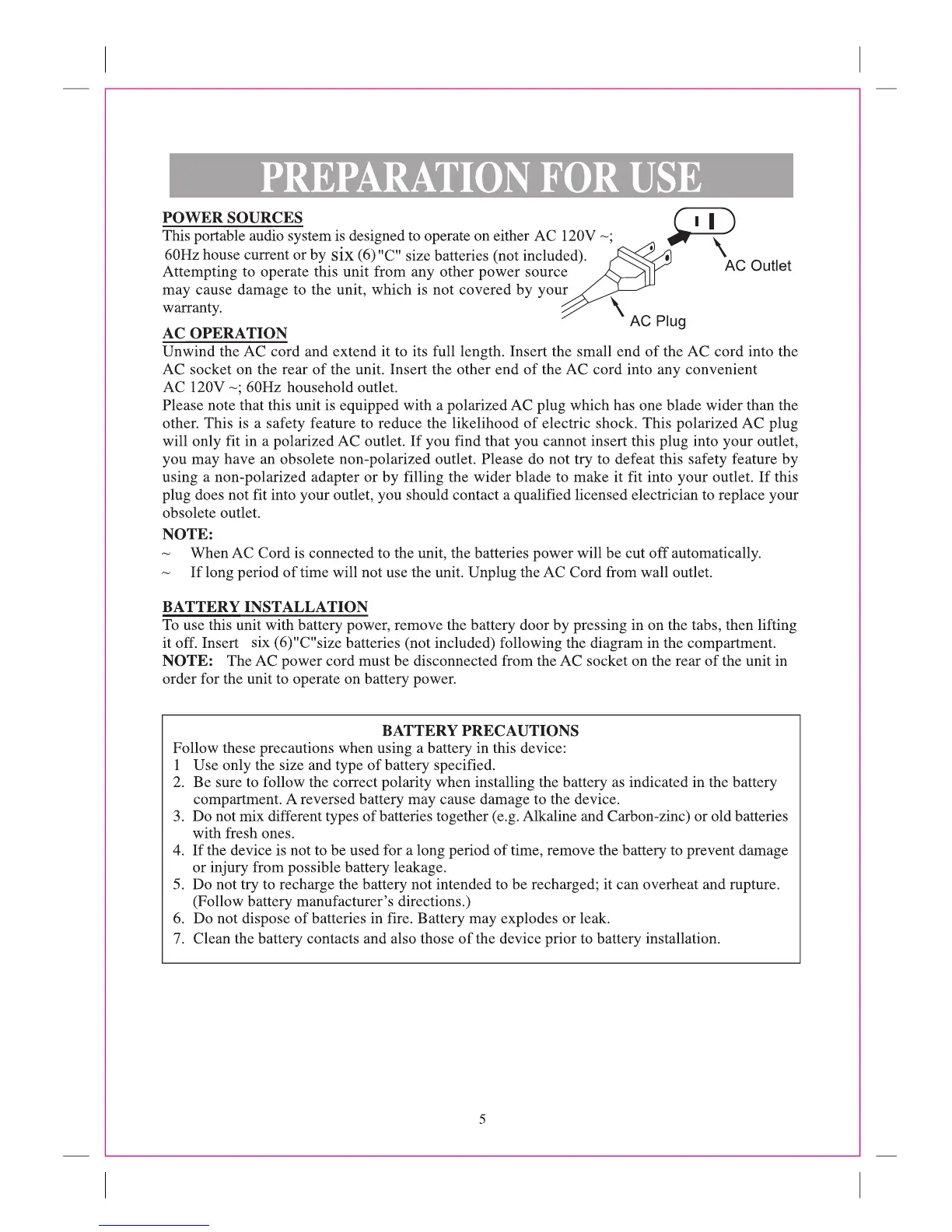 Craig CD6920 - Preparation for Use; Power Sources; AC Operation; Battery Installation