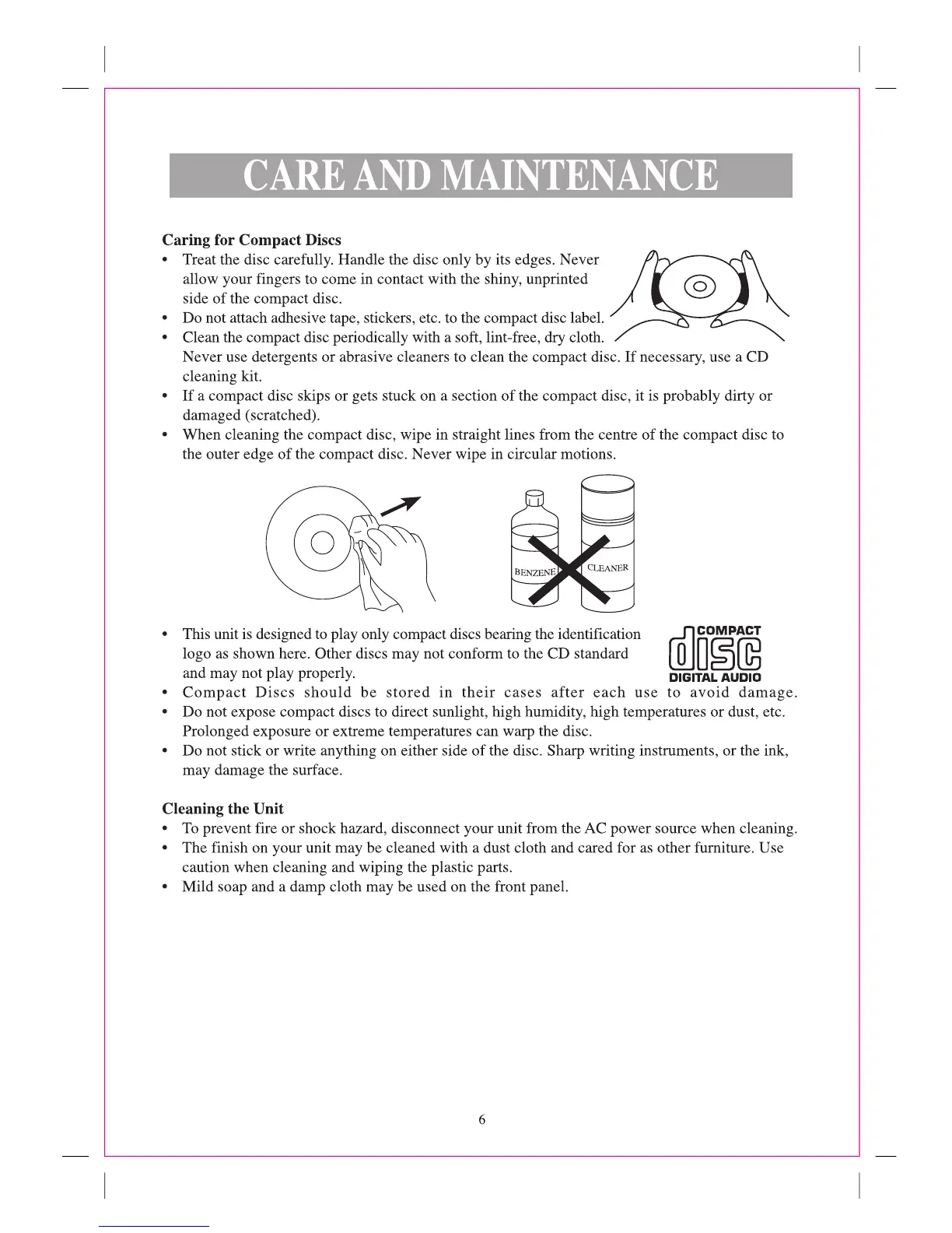 Craig CD6920 - Care and Maintenance; Caring for Compact Discs; Cleaning the Unit