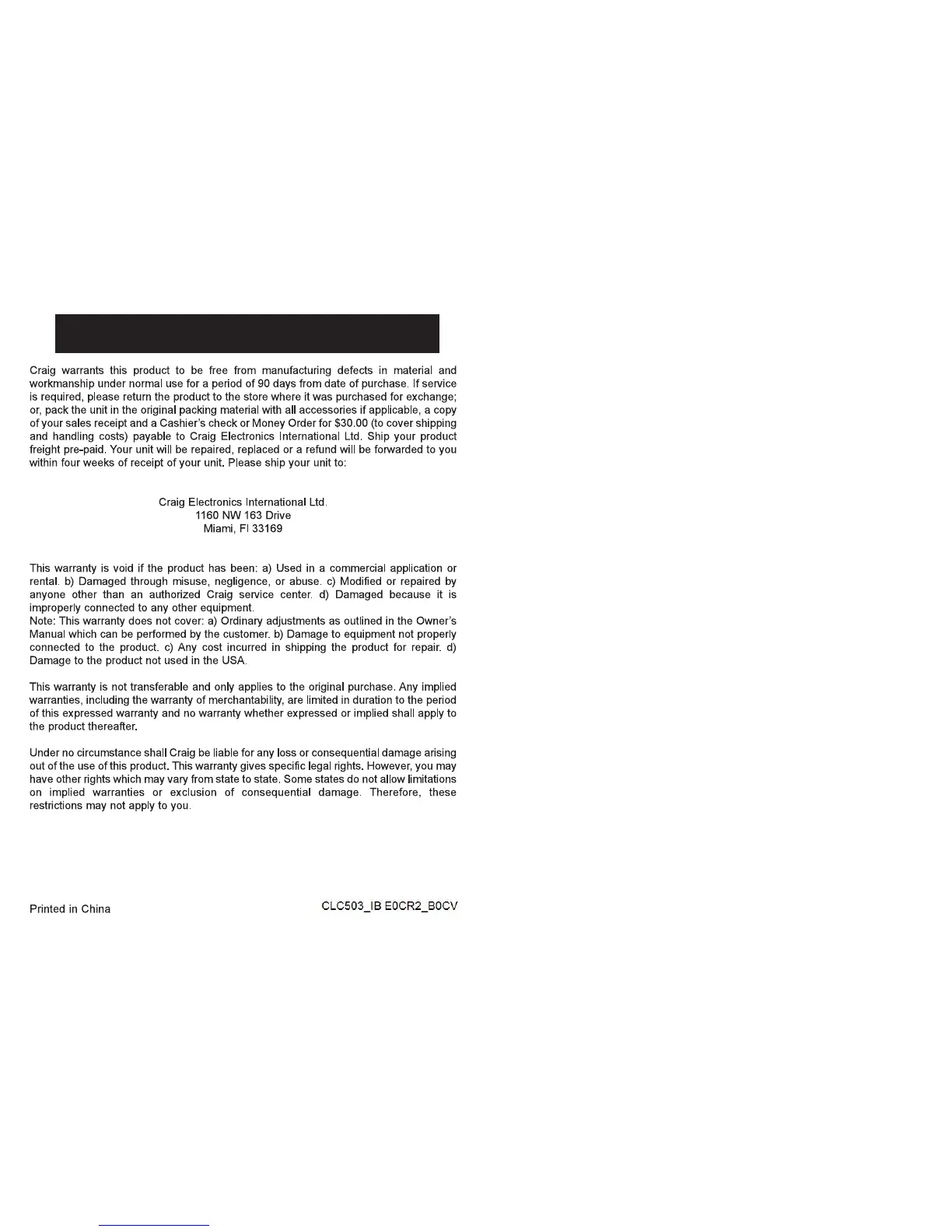 Craig CLC503 - Limited Warranty; Warranty Terms and Conditions