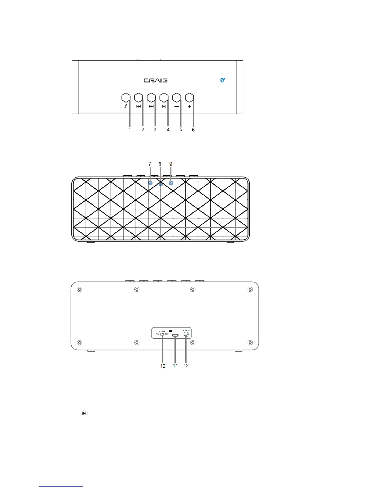 Craig CMA3559 - Location of Controls; Top View; Front View; Back View