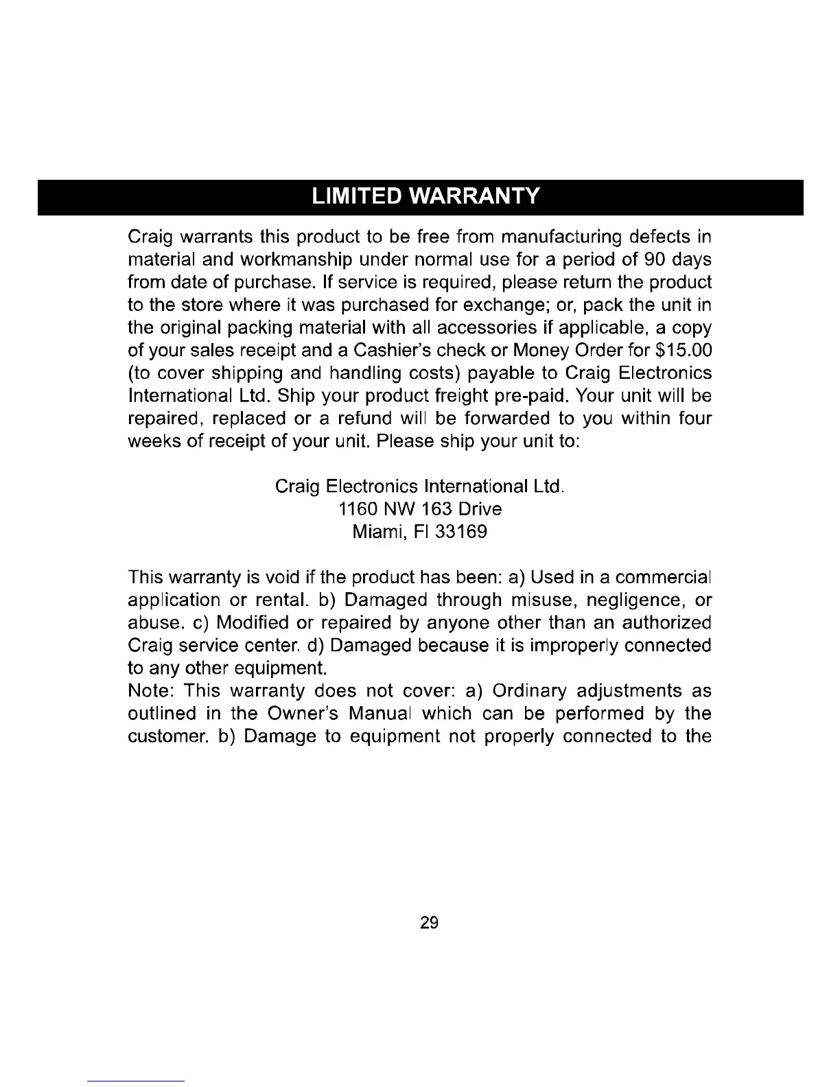 Craig CMP615D - LIMITED WARRANTY; Warranty Coverage and Duration