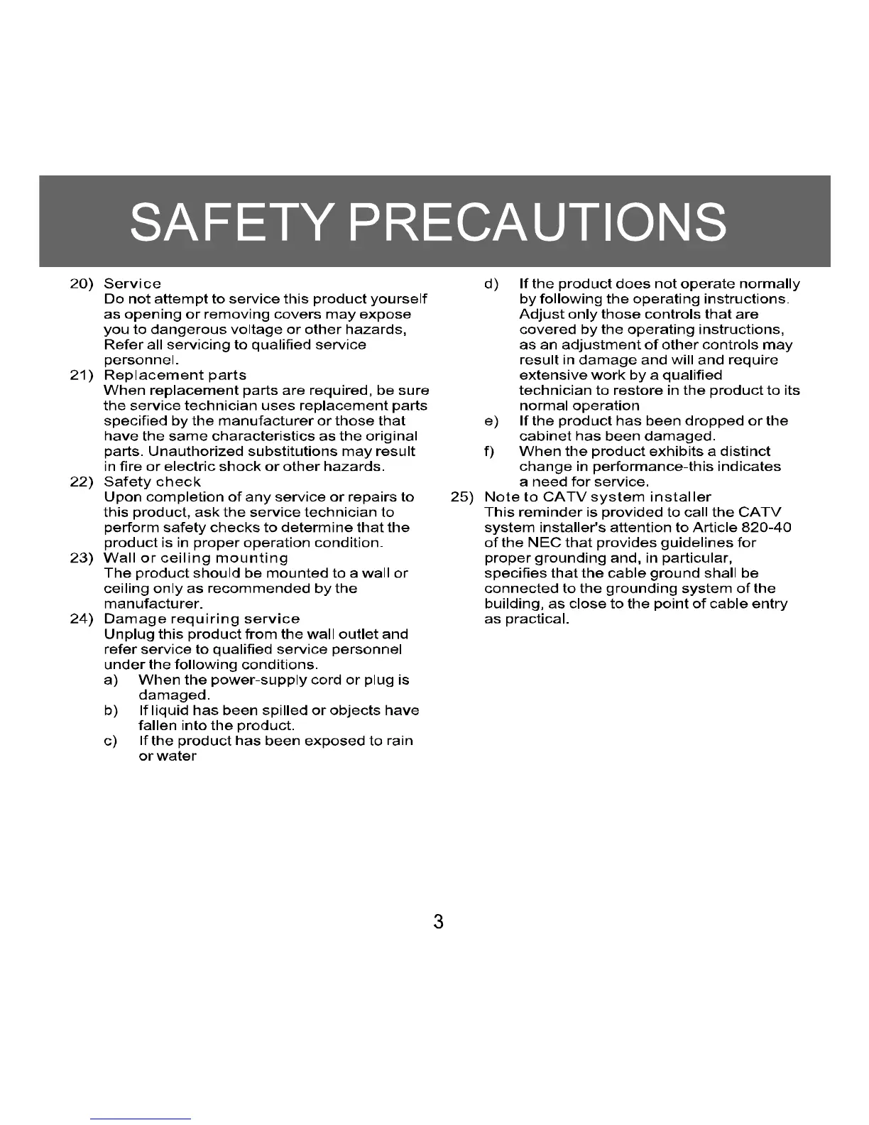Craig CMP615D - Servicing, Parts, and Safety Checks; Mounting, Damage Response, and CATV Note