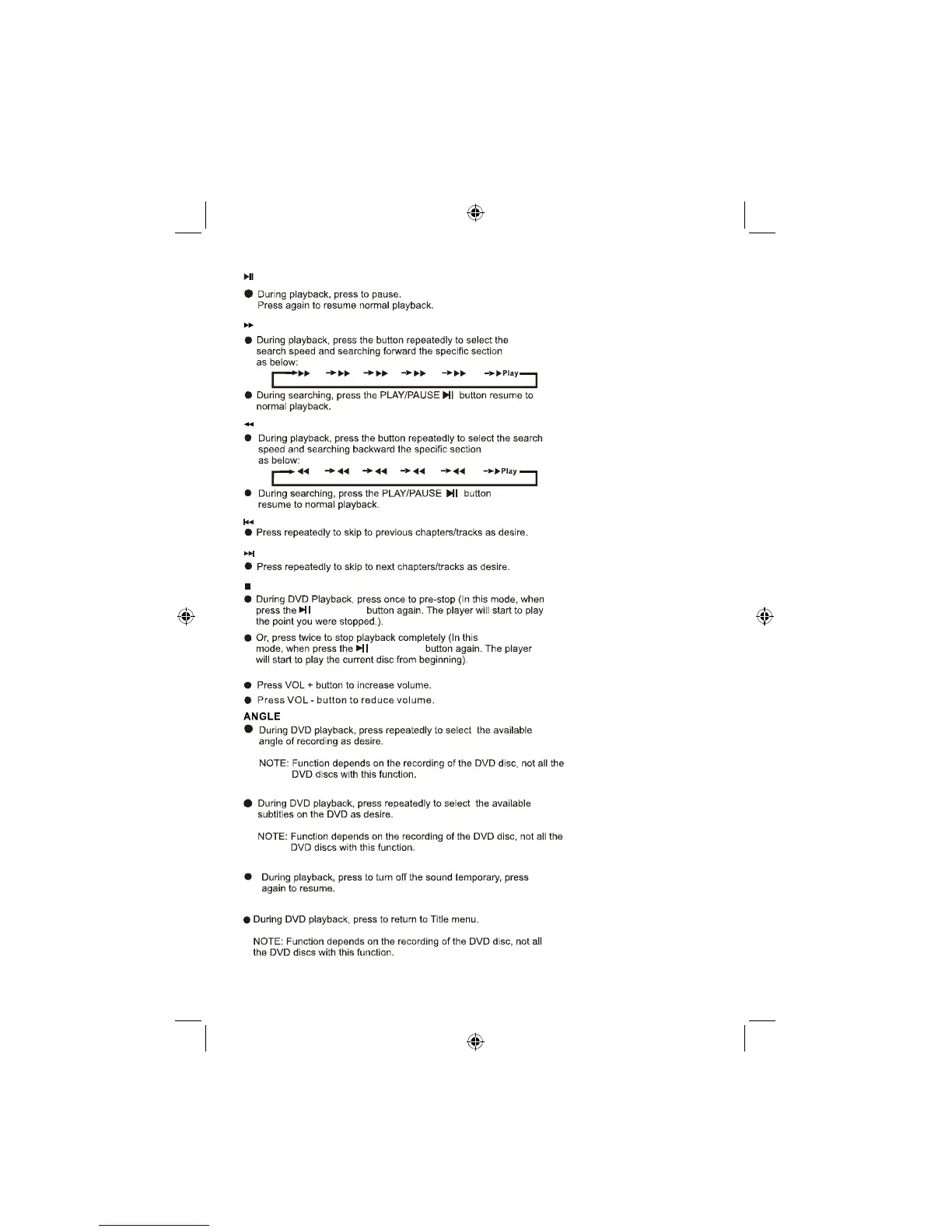 Craig CTFT712 - Remote Control Function Details; Remote Control - Fast Search and Skip; Remote Control - Stop, Volume, Angle; Remote Control - Subtitle, Mute, Title;PBC