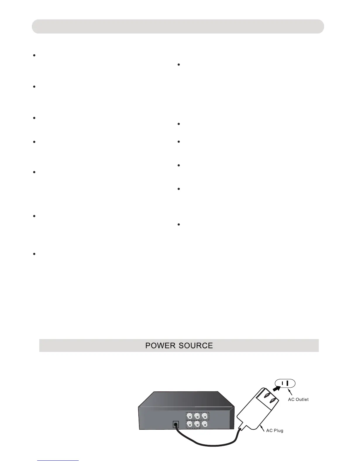 AC/DC Adaptor into a conveniently located AC outlet having AC 100-240V~, 50/60 Hz.