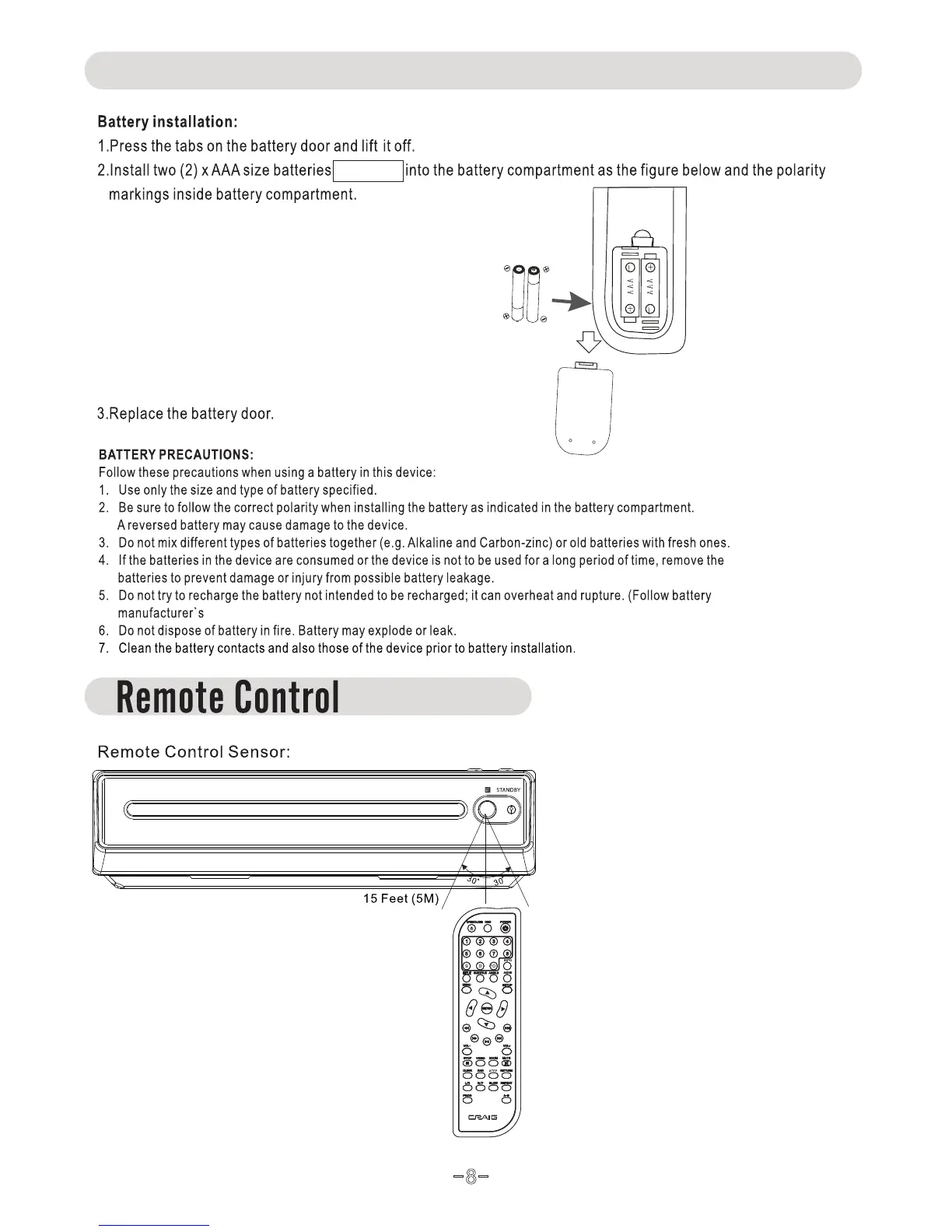 Craig CVD512a - Battery Installation and Remote Operation; Battery Installation and Precautions; Remote Control Sensor and Range
