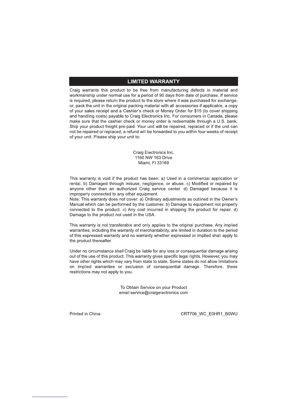 Craig INTERCEPTOR - Limited Warranty; Warranty Terms and Claims