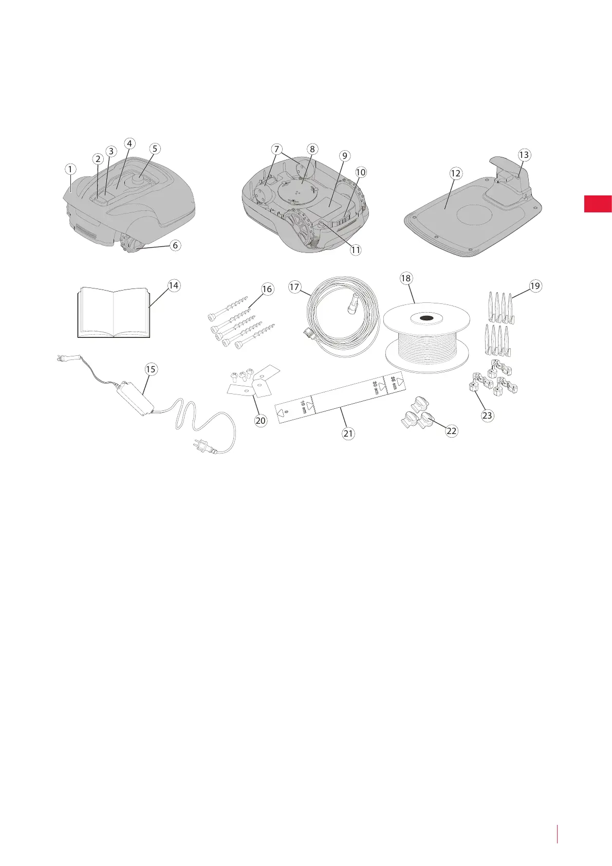 Déballez la tondeuse et le matériel d'installation. Assurez-vous que toutes les pièces en Figure 1 sont incluses et