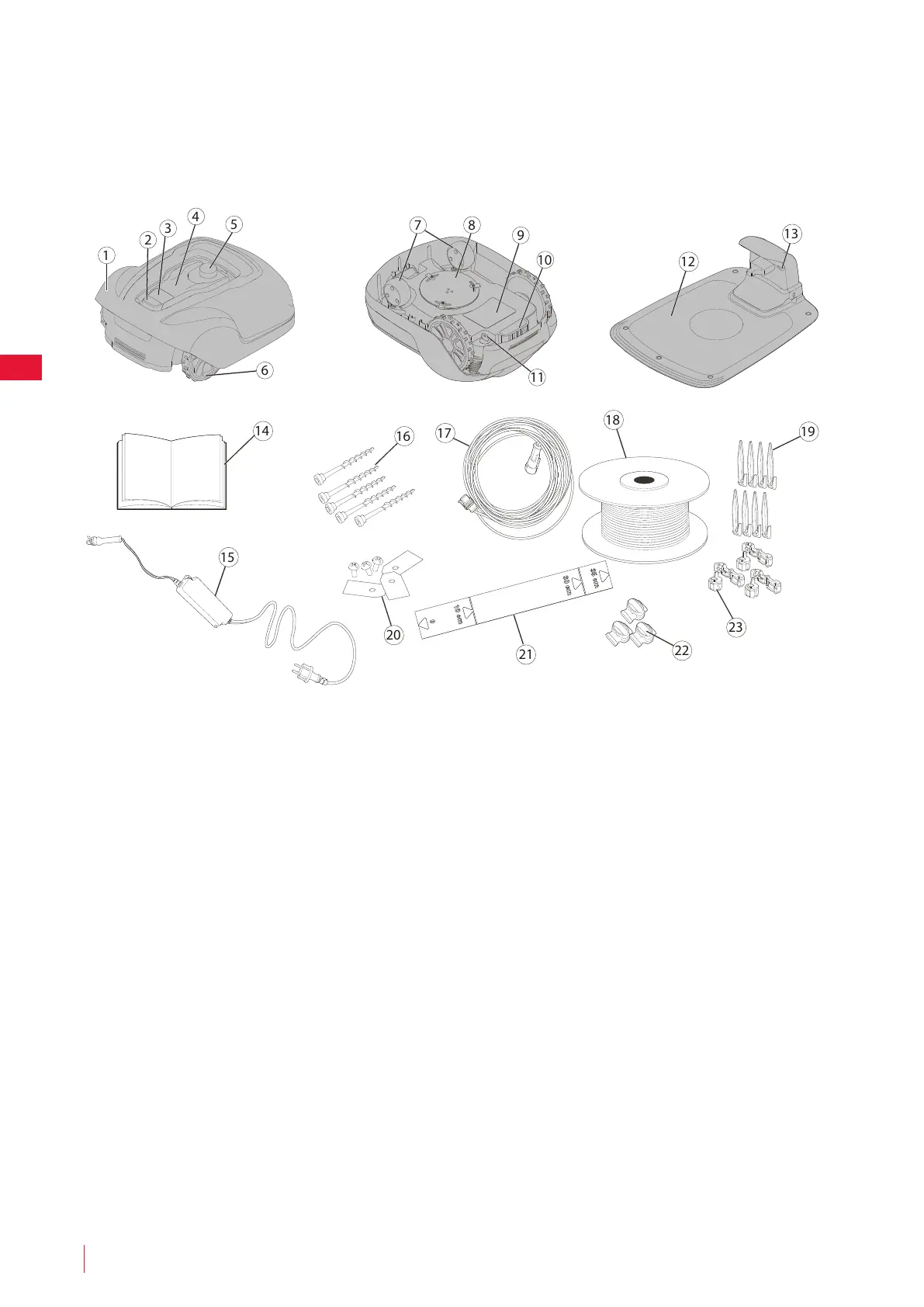 Desencaixotar o corta-relva e materiais de instalação. Certifique-se de que todas as peças mostradas na Figura