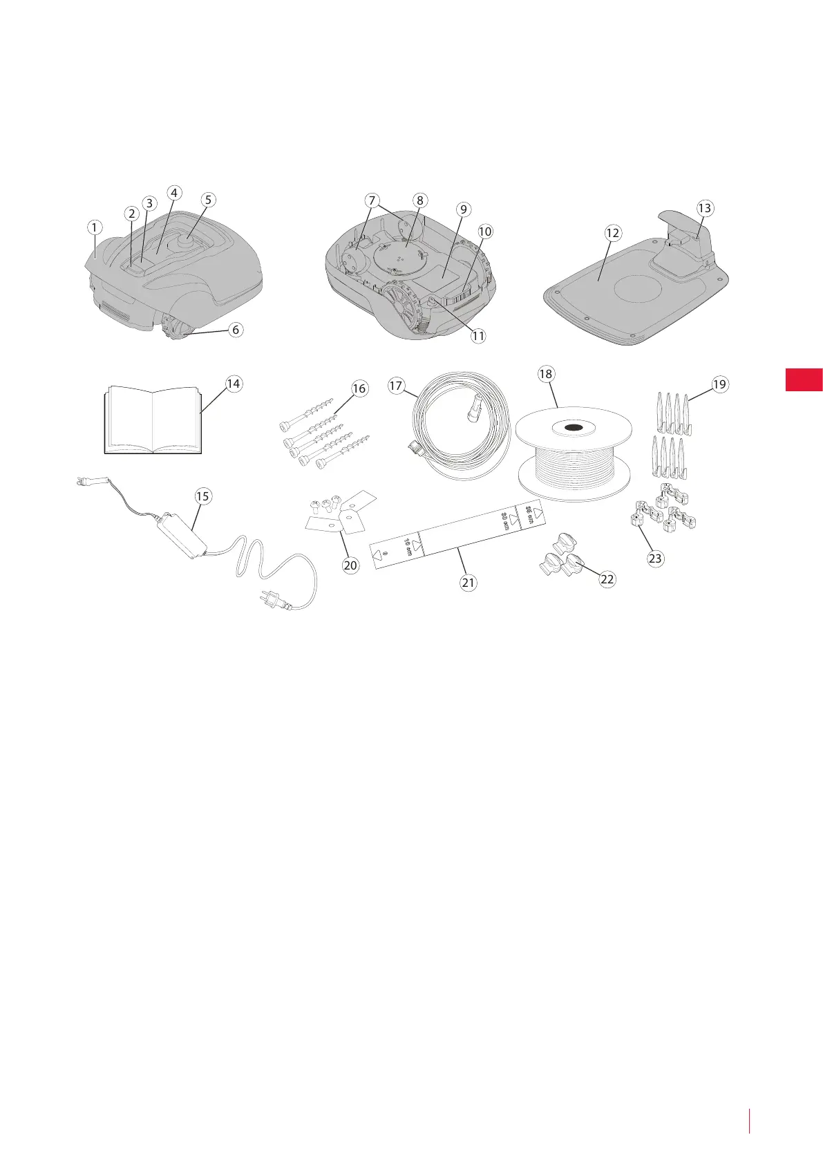 Haal de grasmaaier en het installatiemateriaal uit de verpakking. Controleer of alle onderdelen, die in Aeelding