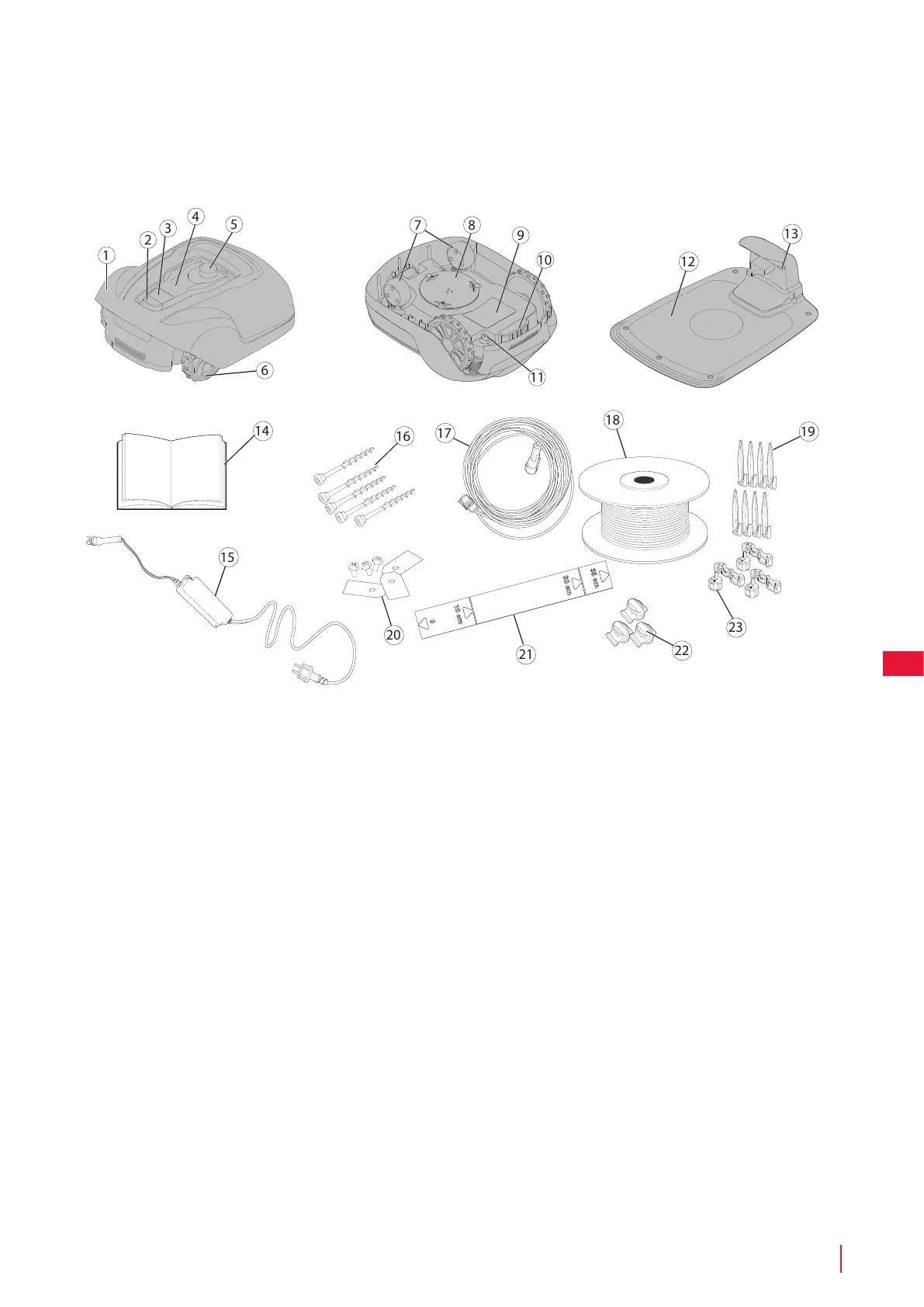 Ta gressklipperen og installasjonsmateriellet ut av esken. Pass på at alle delene i Figur 1 følger med og er