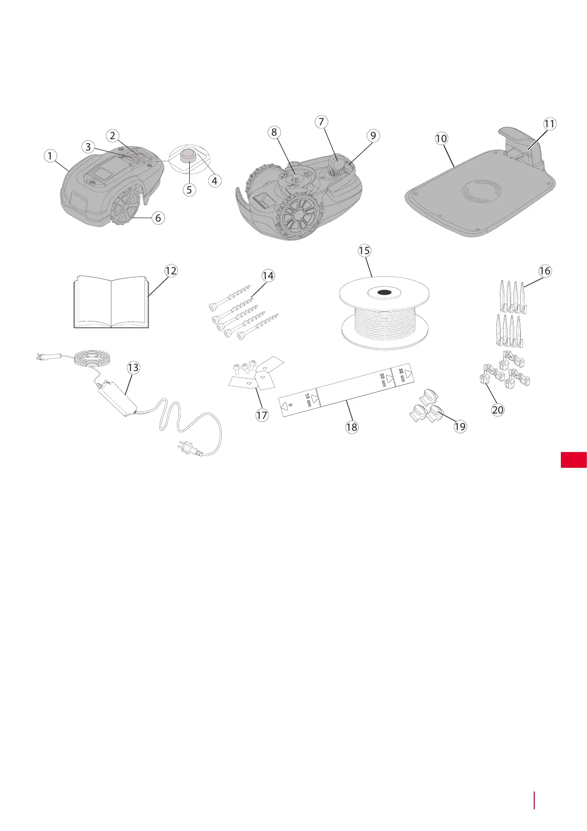 Tag plæneklipperen og installationsdelene ud af emballagen. Kontrollér, at alle dele vist i figur 1 forefindes i