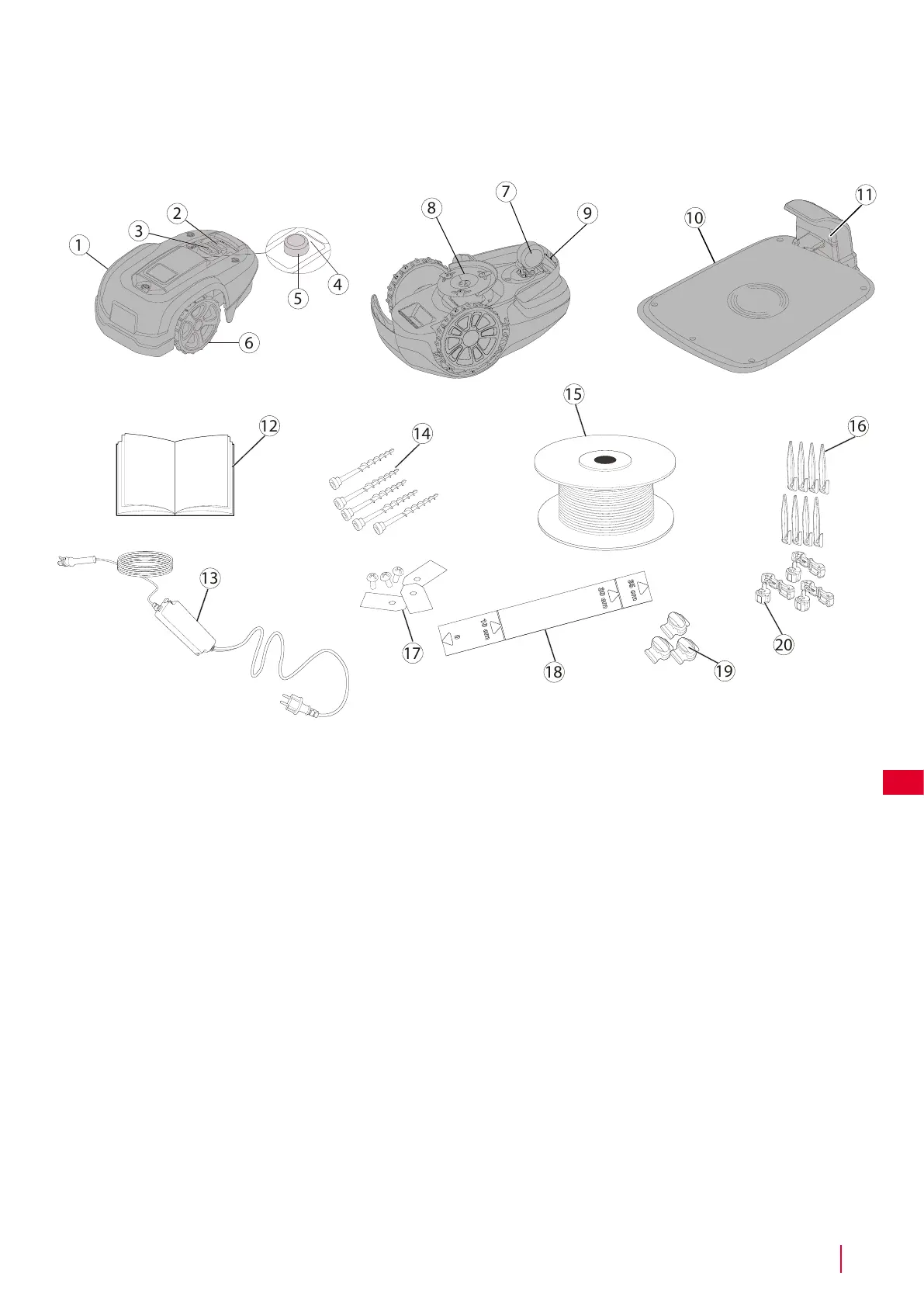 Prosimy wypakować kosiarkę i materiały instalacyjne. Należy upewnić się, że wszystkie części pokazane