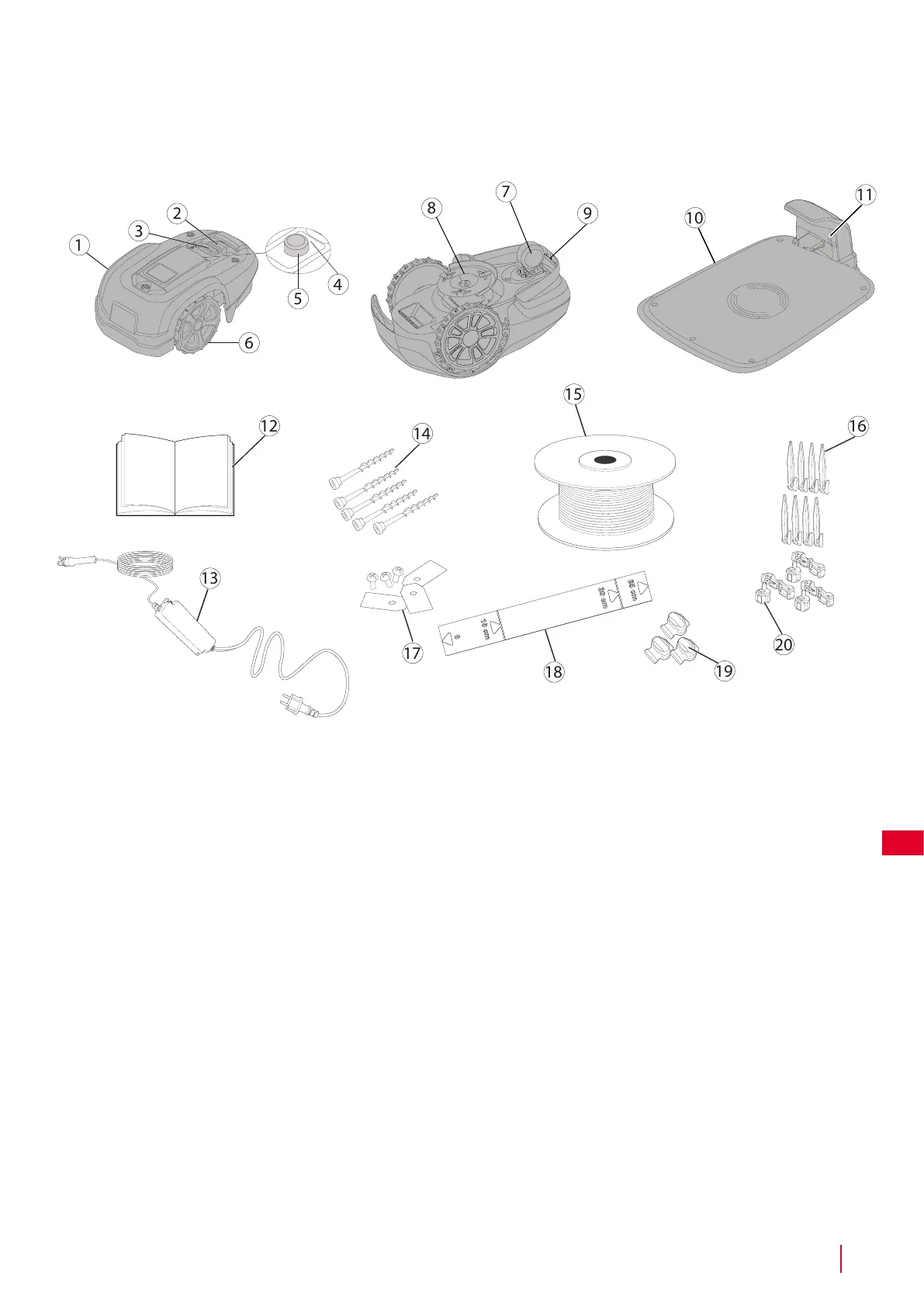 Vyjměte sekačku a instalační materiály z krabice. Ujistěte se, že všechny díly zobrazené na obrázku 1 jsou