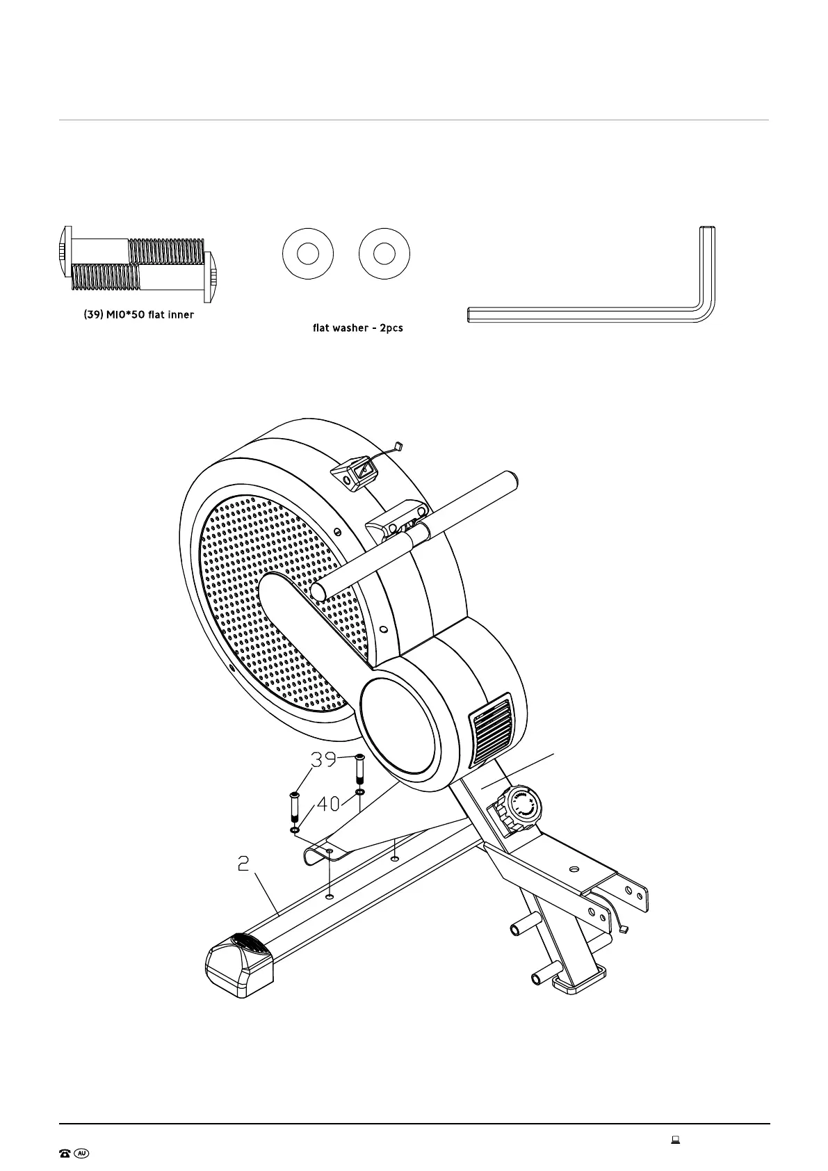 Attach the Front Stabilizer (2) to the Main Frame (1) with 2 x M10*50 screws (39), 2 x washers (40).