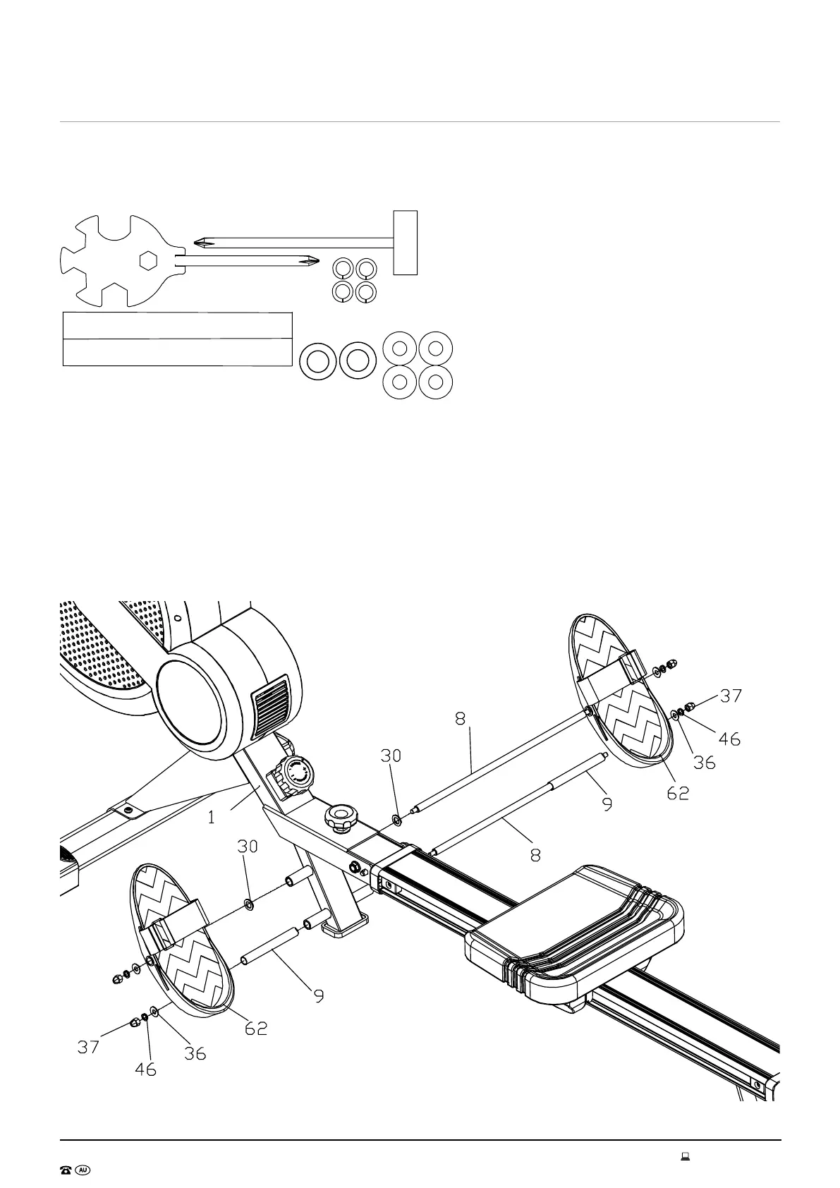 Insert the other pedal axle (8) through both washers (30), Pedals (62), and upper holes of the Main
