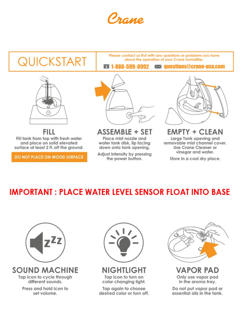 If the red indicator light on your Crane Humidifier is flashing, it means the water level sensor float isn't correctly placed in the base, or there's no water in the base. Make sure the float is secure and refill the water tank.